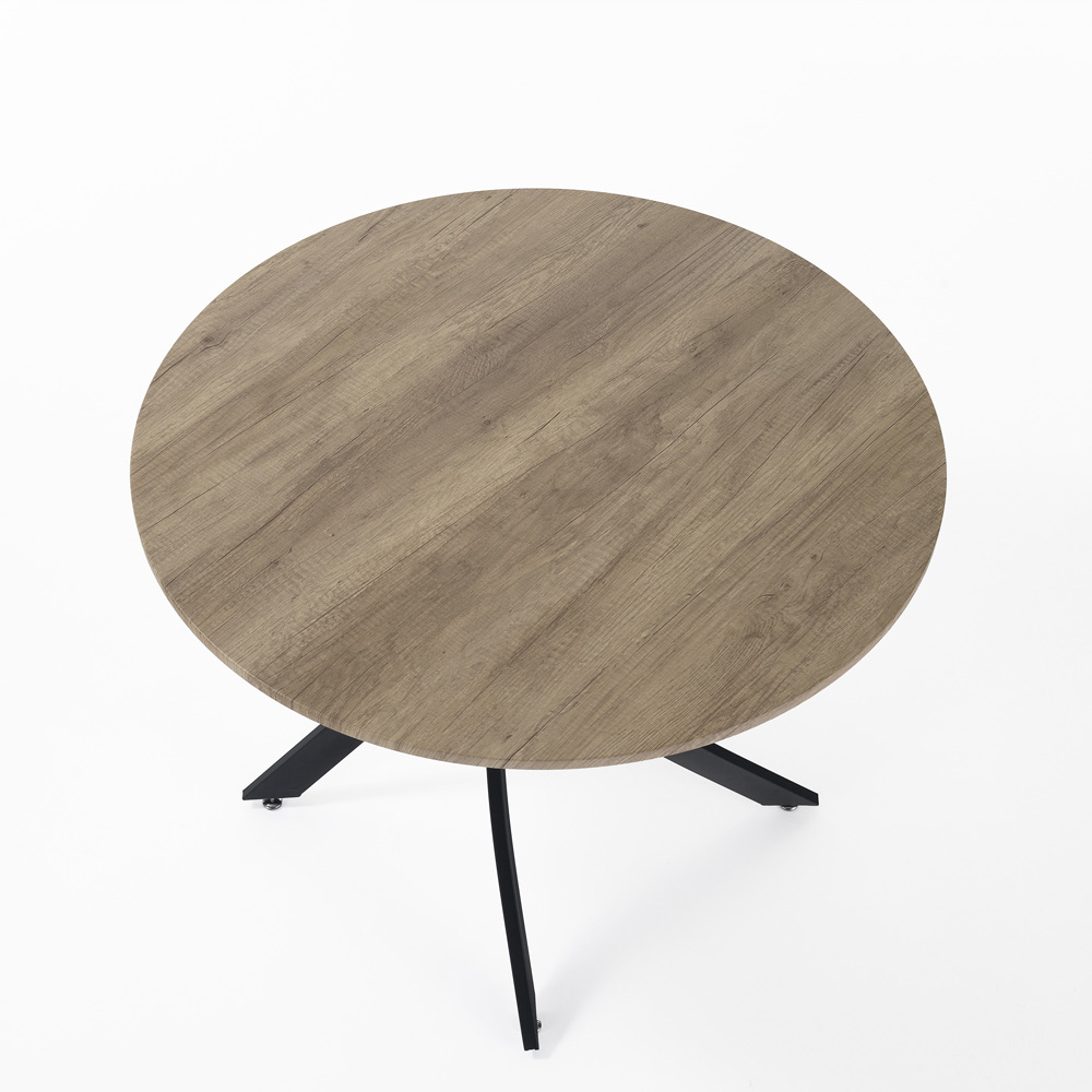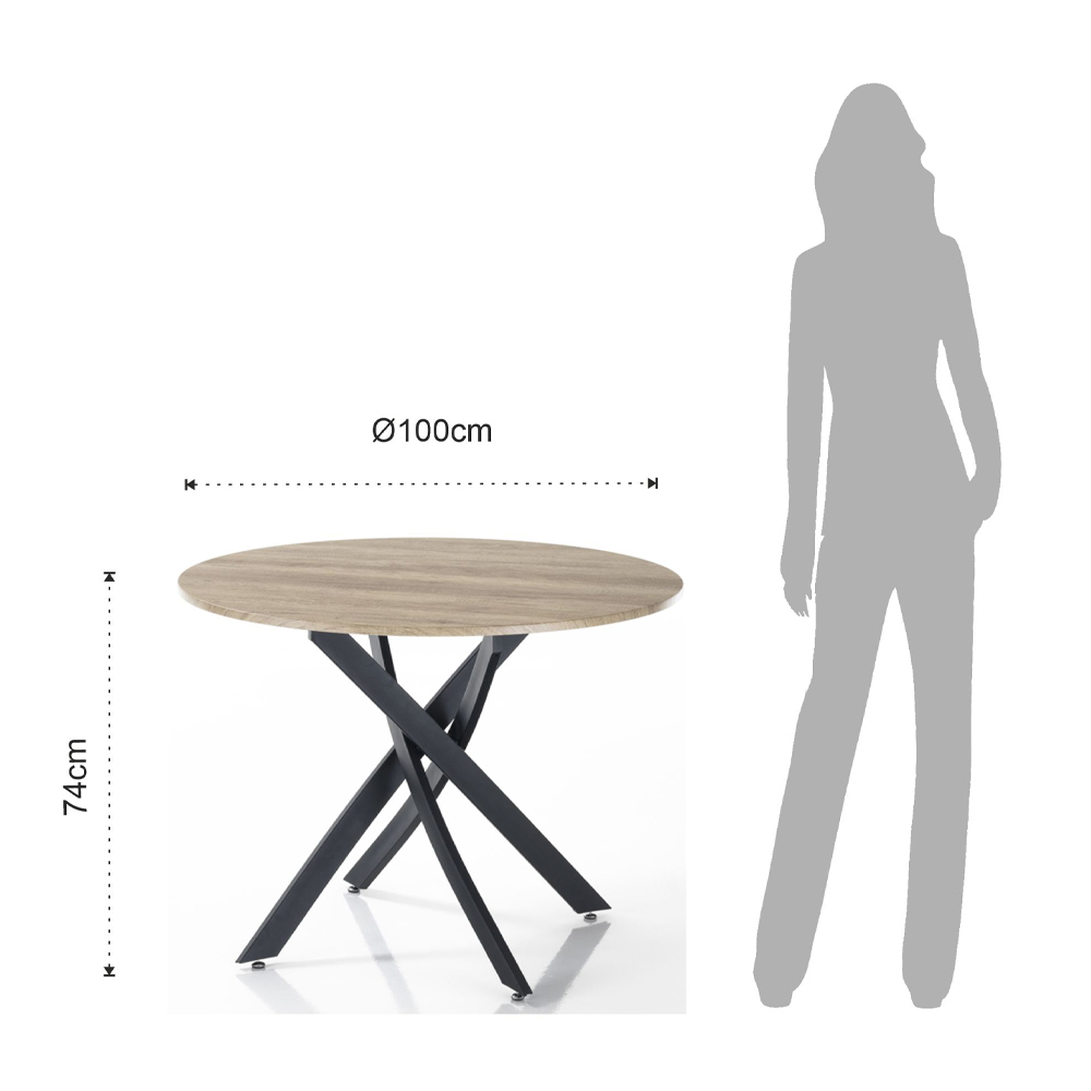 Tisch für den Innenbereich mit runder Platte aus MDF mit Melaminharzbeschichtung in Eichenoptik . 18 mm, Sockel aus mattschwarz lackiertem Stahl , komplett . Dieses Produkt ist die perfekte Idee für alle, die dem Raum, sei es ein Wohnzimmer, eine Küche oder eine Objektumgebung, einen Hauch von Modernität und Frische verleihen möchten. Die für die Konstruktion ausgewählten Materialien sind von höchster Qualität , um dem Kunden einen Tisch zu garantieren, der nicht nur schön anzusehen, sondern auch funktional und widerstandsfähig ist und die ganze Handwerkskunst zum Vorschein bringt.