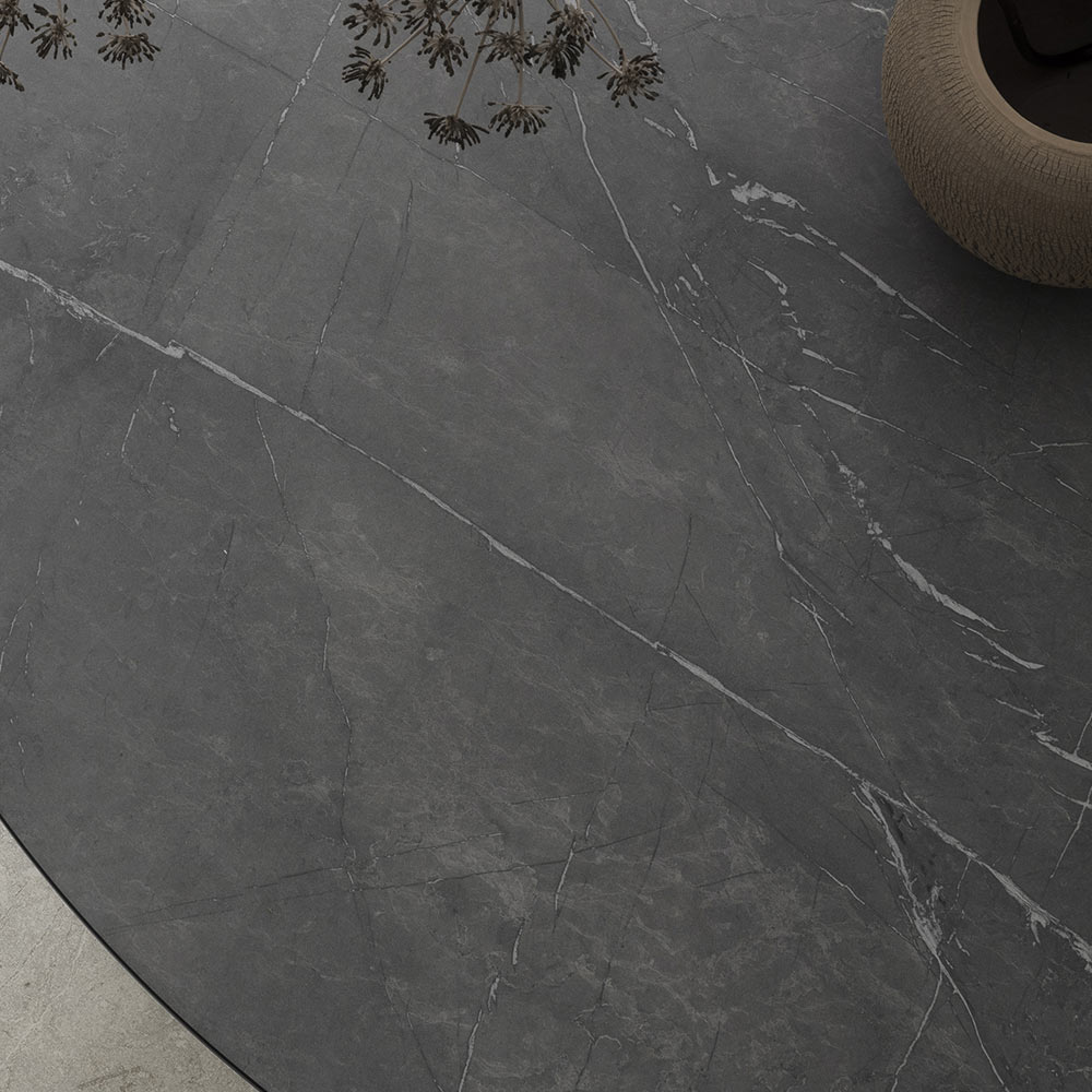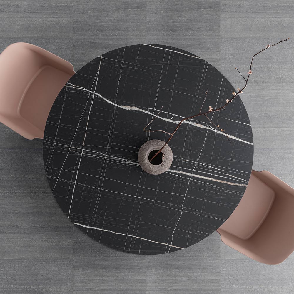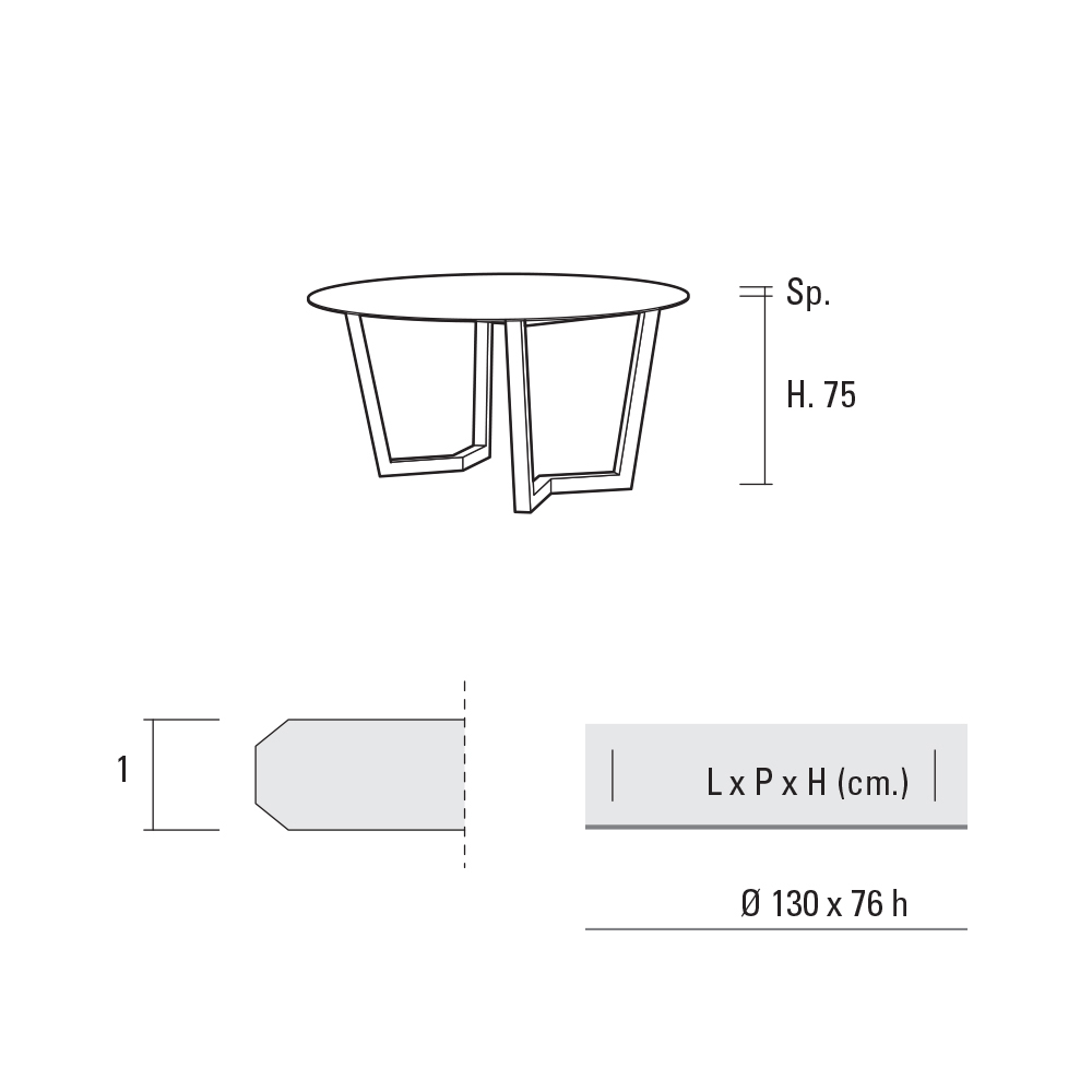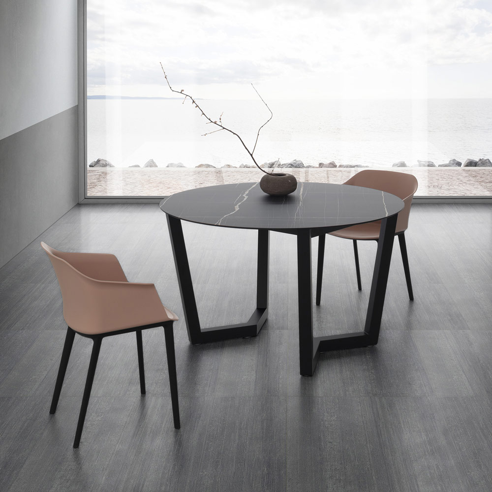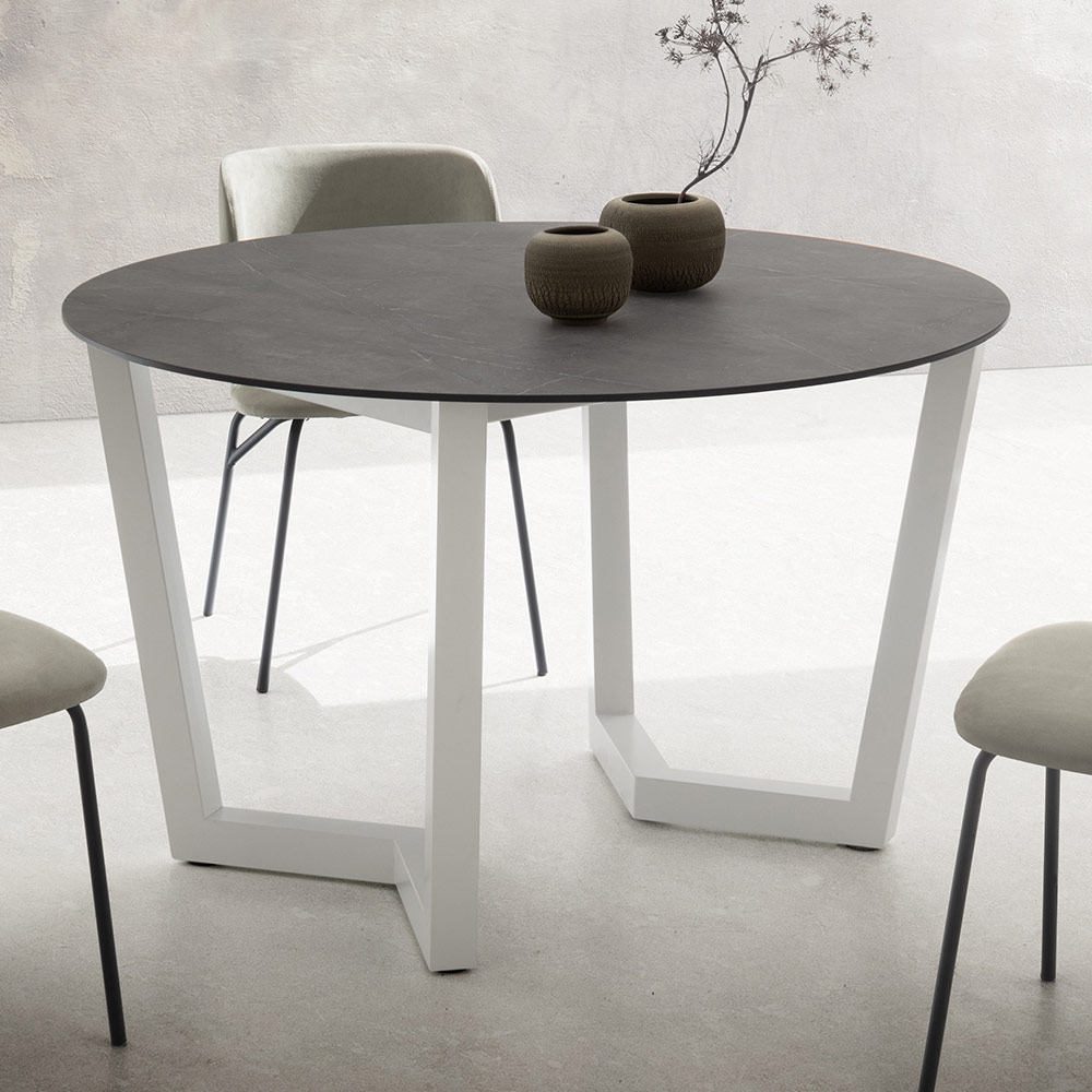 Runder Küchentisch made in Italy mit Basis aus epoxidpulverbeschichtetem Metall und 10 mm dicker geschichteter HPL- Platte. Ein Möbelstück, das sich durch eine elegante und skulpturale Struktur auszeichnet, die aus der Kombination von Materialien unterschiedlicher Art zusammen mit der Leidenschaft für die Herstellung entsteht.
