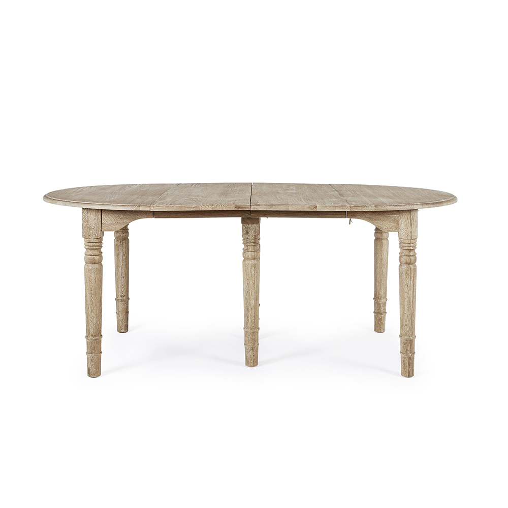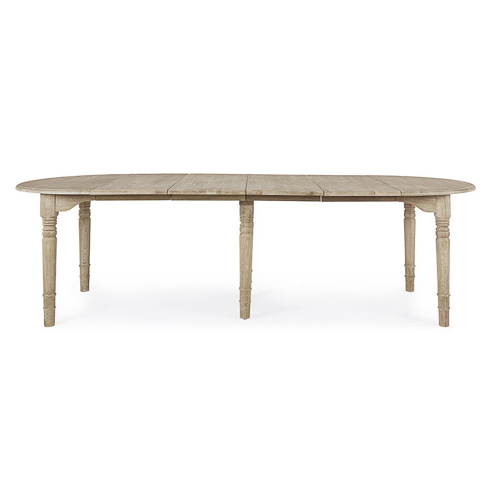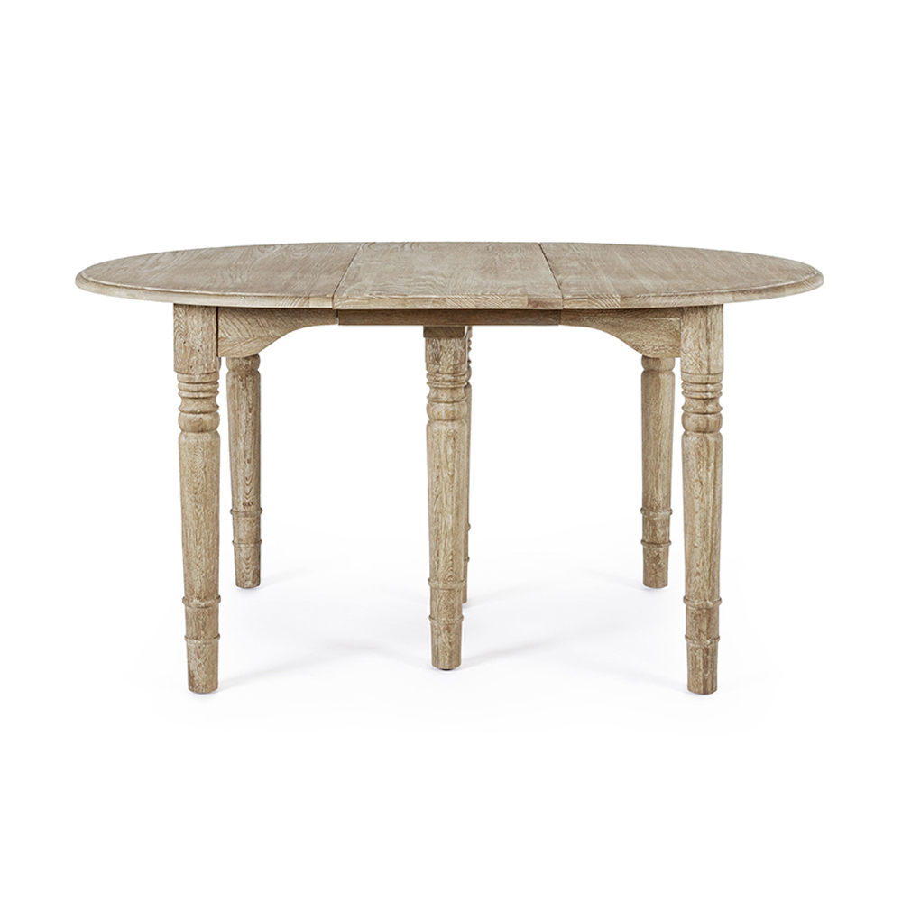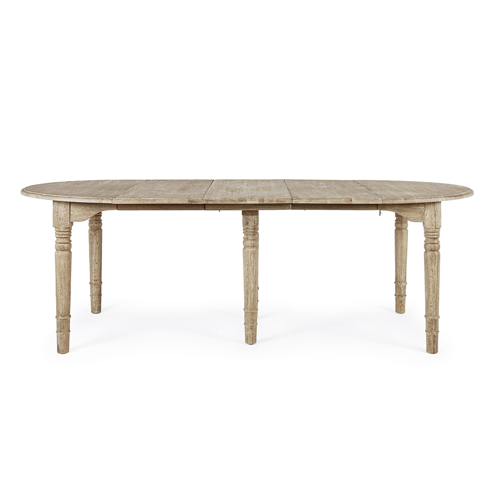 Runder und ausziehbarer Esstisch aus gealtertem Holz für bis zu 10 Personen.
