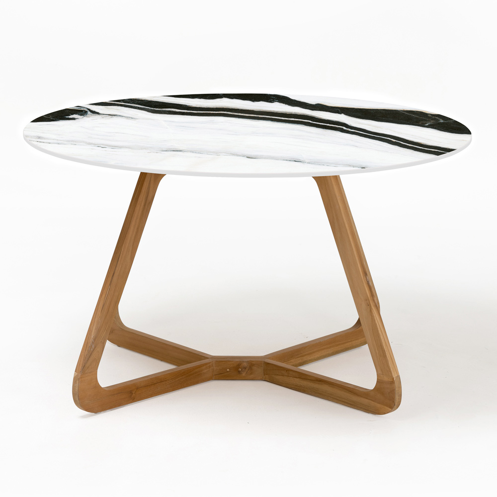 in Italien hergestellt. Dieser Gartentisch ist ein einzigartiges Designstück, das die natürliche Schönheit von Holz mit der Funktionalität moderner Keramik verbindet. Die Tischplatte imitiert perfekt Panda White-Marmor, bekannt für seine schwarzen Adern auf reinweißem Hintergrund, und bietet einen markanten optischen Kontrast, der jedem Außenbereich einen Hauch von Eleganz verleiht.