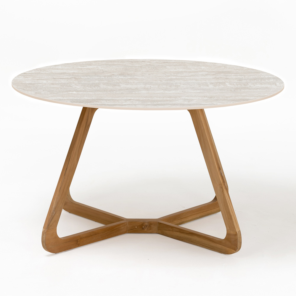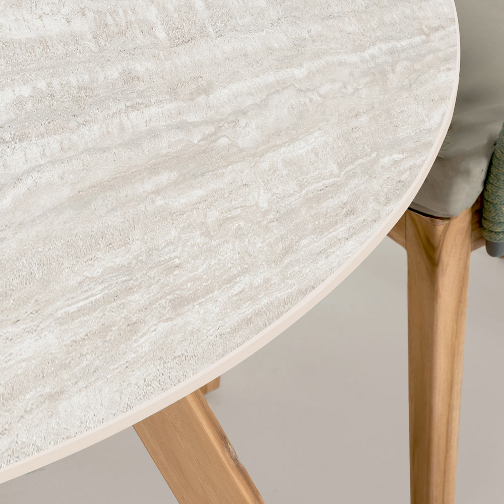 Tisch für den Außenbereich mit einer Basis aus massivem natürlichem Teakholz (35 mm dick), einer Platte aus Infinity-Steinzeugkeramik (12 mm dick) mit einem matten Finish in hellem Travertin und einem Untergestell aus Okumé-Bootssperrholz , vollständig in Italien hergestellt.