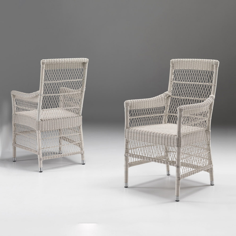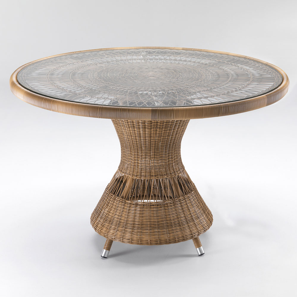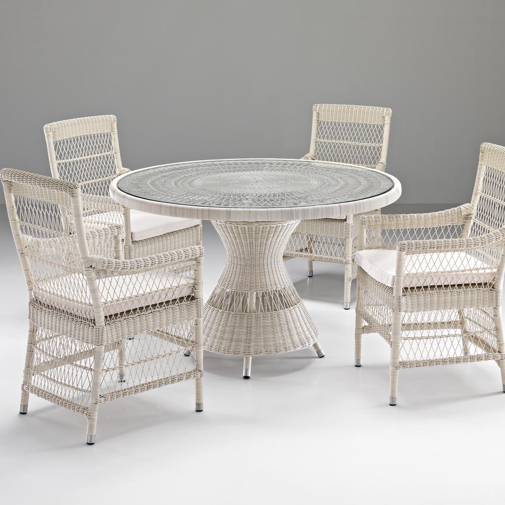 Garten Komposition bestehend aus: runder Tisch mit Aluminium Basis und Polyrattan Geflecht Marke REHAU und Glasplatte, 4 Sessel mit Armlehnen mit Aluminiumrahmen und Polyrattan Geflecht Marke REHAU. Diese Zusammensetzung zeichnet sich durch seine starke klassisches Design, ein Stil aus der Vergangenheit in der Mode in den 60er und 70er Jahren in einem Outdoor-Schlüssel wiederbelebt. Der Geflechtstil ist raffiniert und zart und zusammen mit der sehr hohen Qualität der Materialien und den entschiedenen Formen machen diese Garnitur perfekt für die Einrichtung von Innen- und Außenbereichen, sowohl im privaten als auch im Objektbereich wie Terrassen, Veranden, Gärten, aber sie finden auch einen perfekten Platz am Pool.