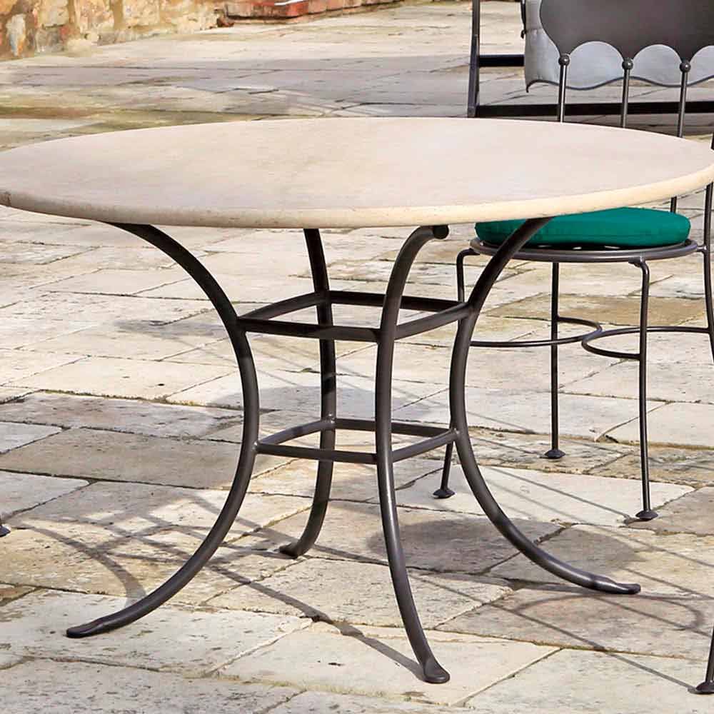 Outdoor Esstisch made in Italy mit anthrazit lackiertem Eisengestell und runder Platte aus hellem Travertin . Eine Einrichtungsidee, die dank der Verwendung von Materialien und Oberflächen mit einer antiken Seele an einen eher klassischen Stil erinnert. Die Struktur bietet dem Produkt eine optimale Stabilität, während die Feuerverzinkung es besonders widerstandsfähig gegen jede Art von Korrosion macht, die Rostbeständigkeit des Metalls über Jahrzehnte garantiert und seine Ästhetik durch eine Beschichtung mit einer rauen Textur bereichert, die den alten Geschmack seiner Formen. Die 100% italienische Handwerkskunst zusammen mit der Liebe zum Detail unterstreicht noch mehr seinen Wert und Wert und bietet so ein hochwertiges Endprodukt, das dank seiner starken klassischen Persönlichkeit und Eleganz ohne Zeit der Travertinplatte, die den Tisch verleiht, jeden Außenbereich charakterisieren kann seine altmodische Ästhetik.