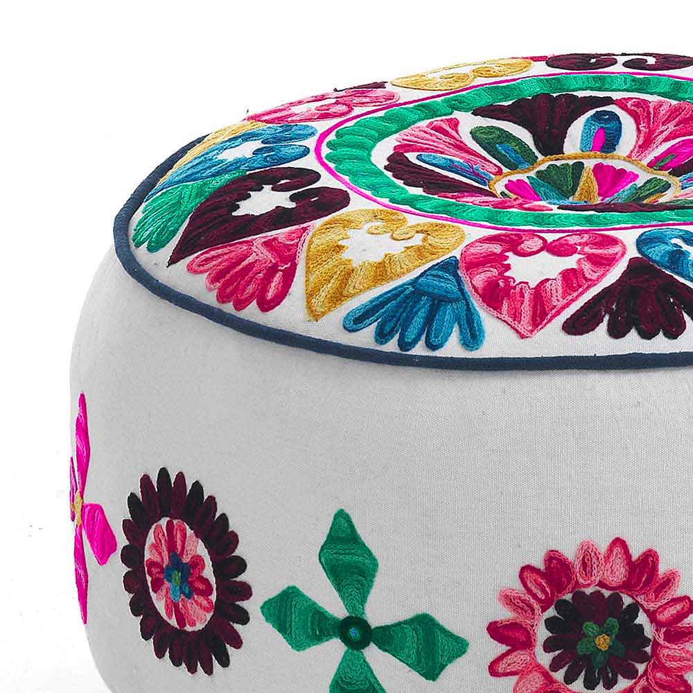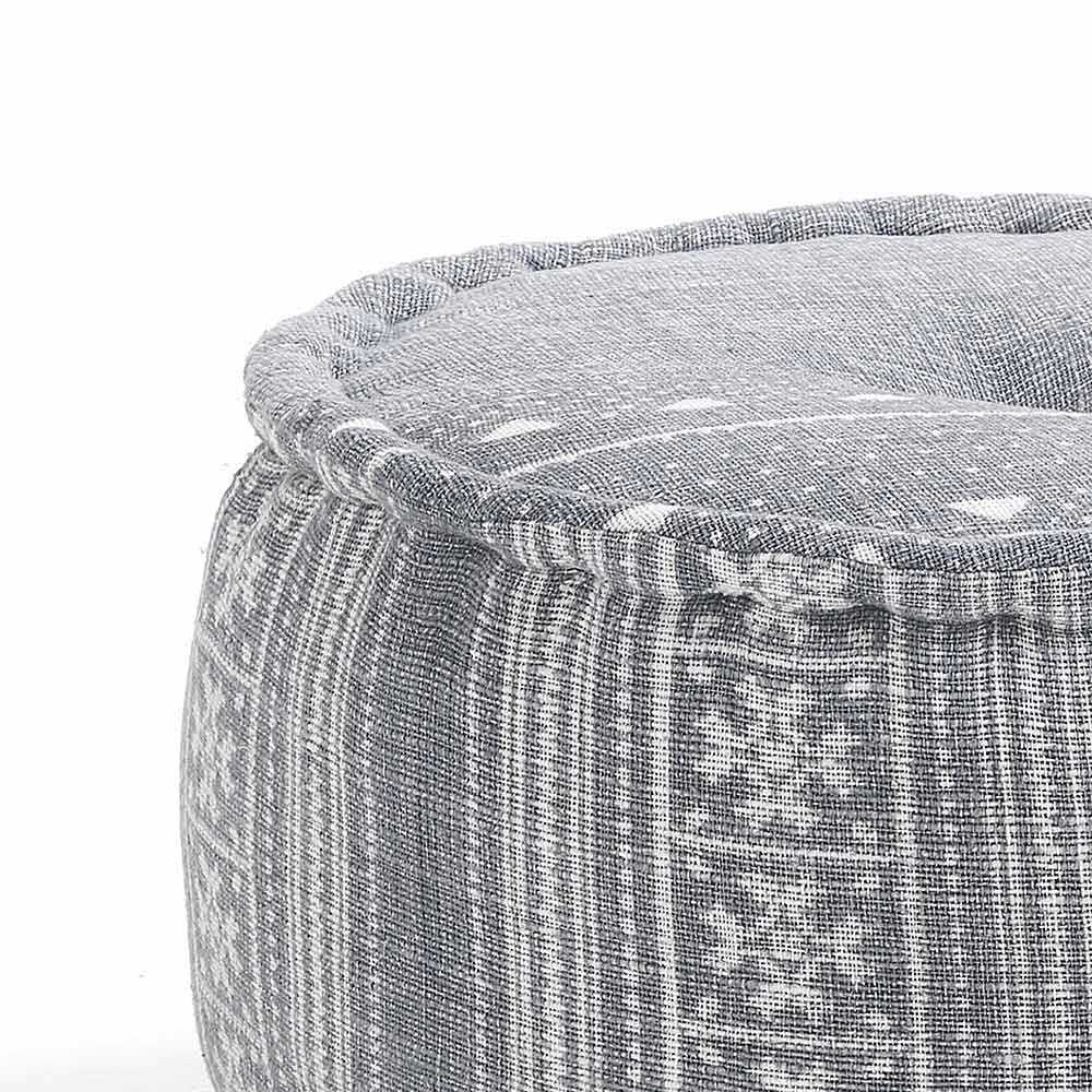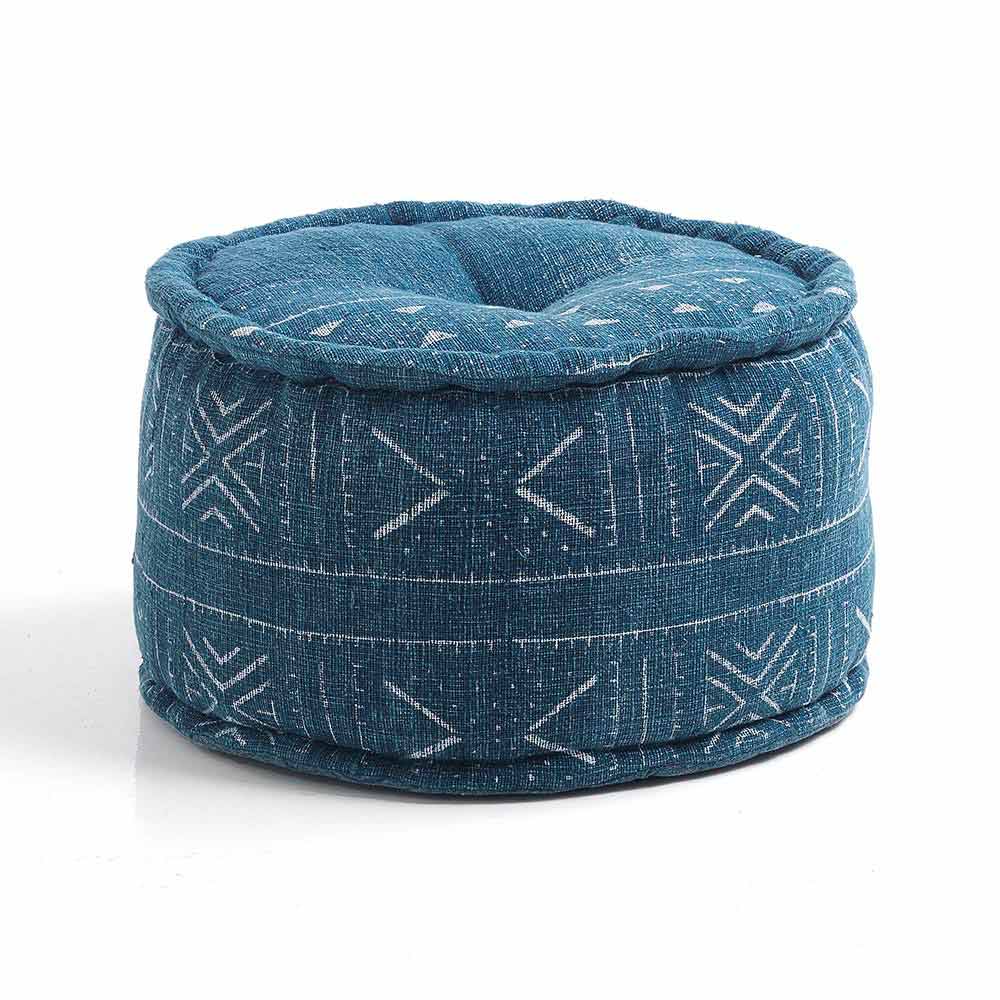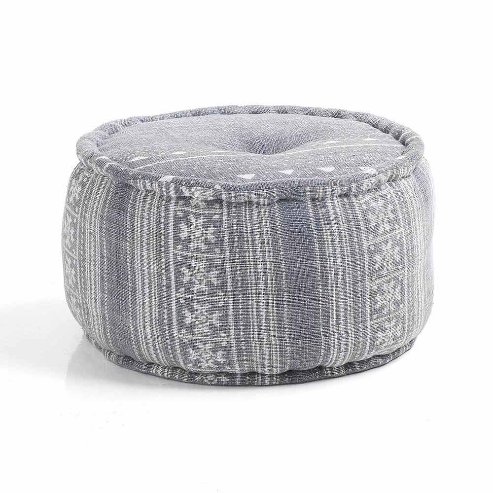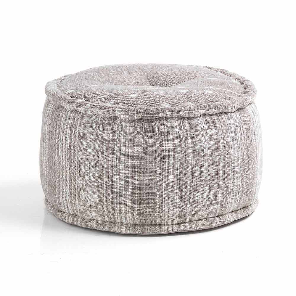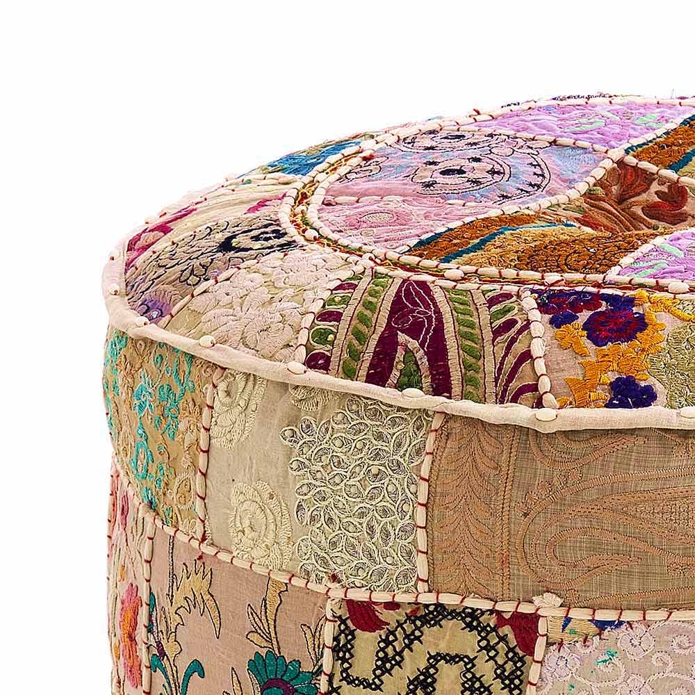 Runde Ottomane mit ethnischem Design aus Patchworkstoff.