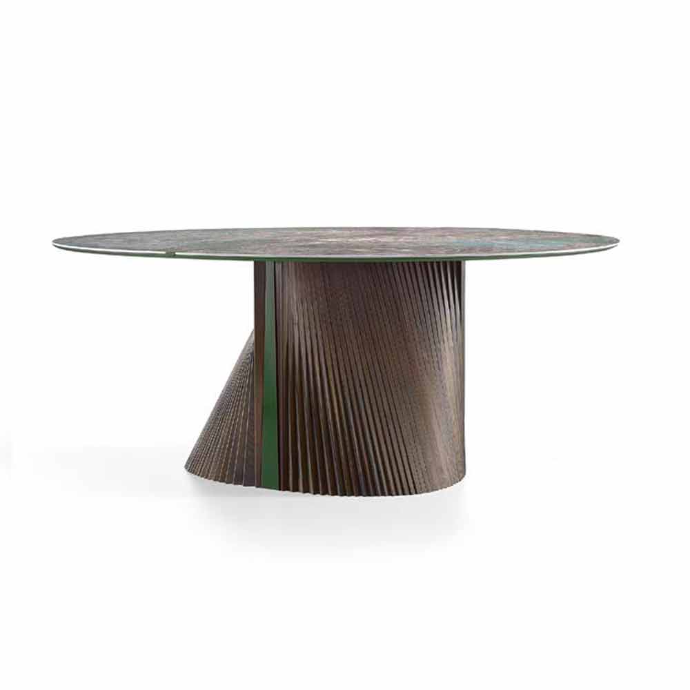 Runder Esstisch mit polierter Steinzeugplatte, hochwertiges Made in Italy-Produkt.