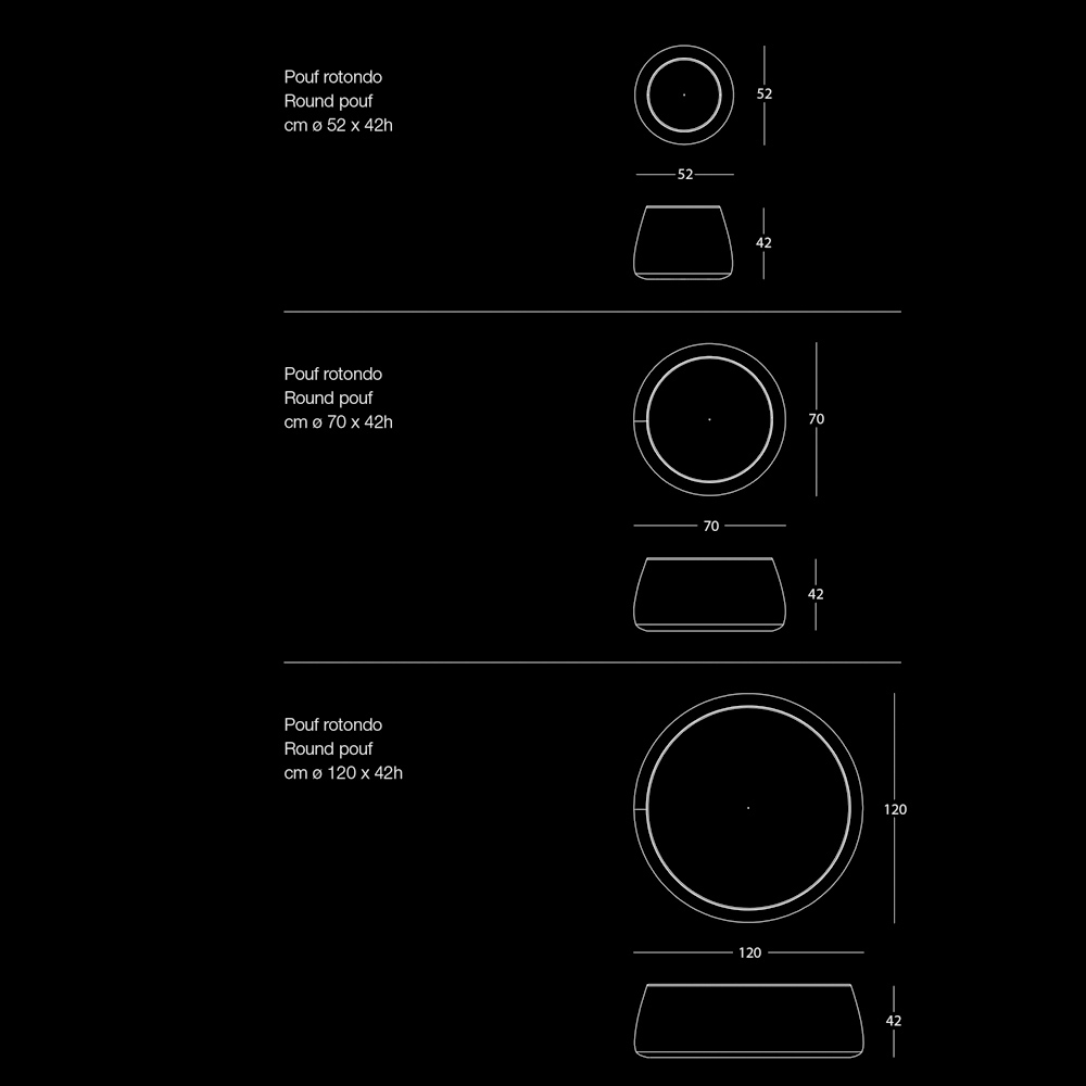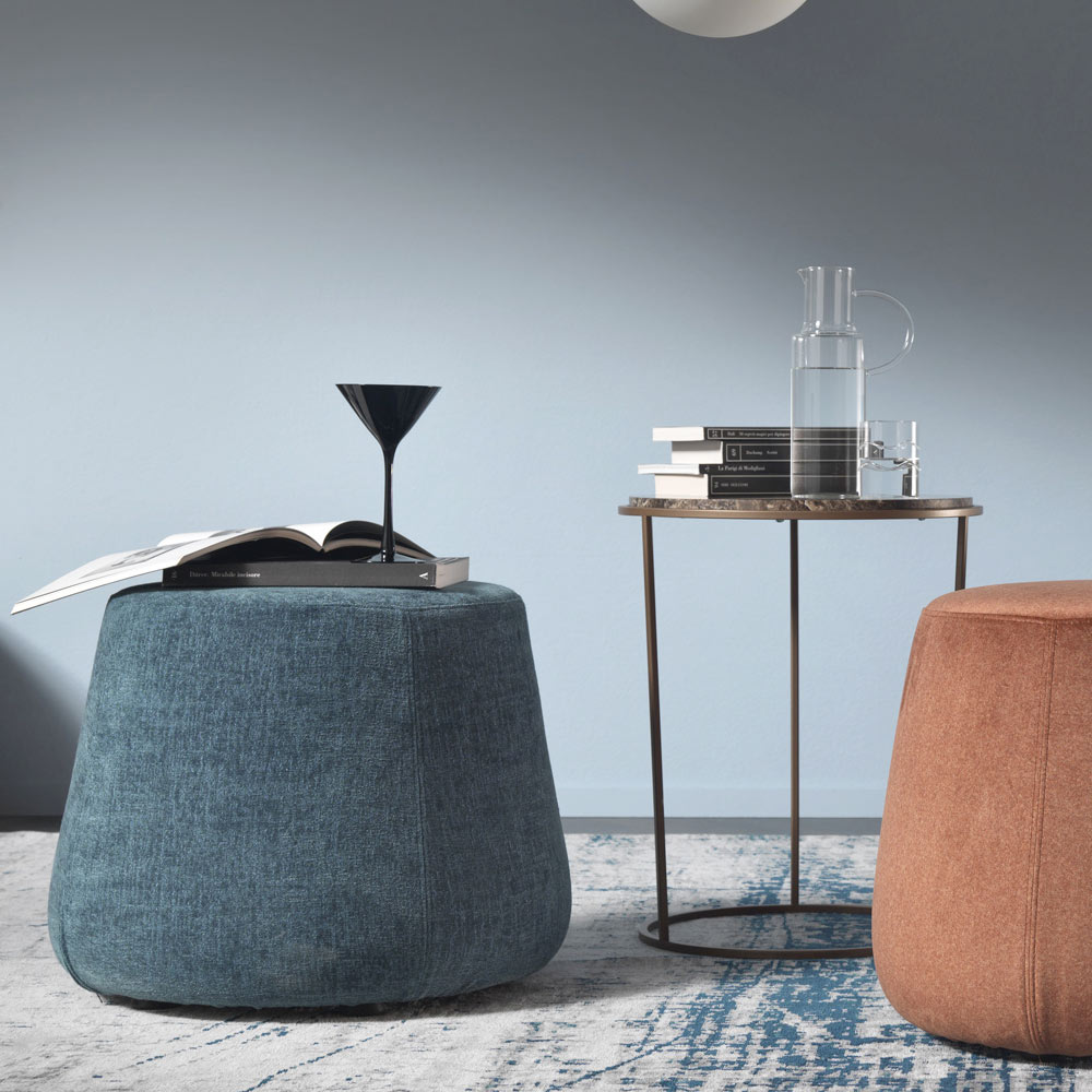 Der Hocker in modernem und rundem Design, der in drei verschiedenen Breiten erhältlich ist, ist vollständig mit einem abnehmbaren weichen Chenille-Bezug überzogen , der in 6 Ausführungen erhältlich ist.