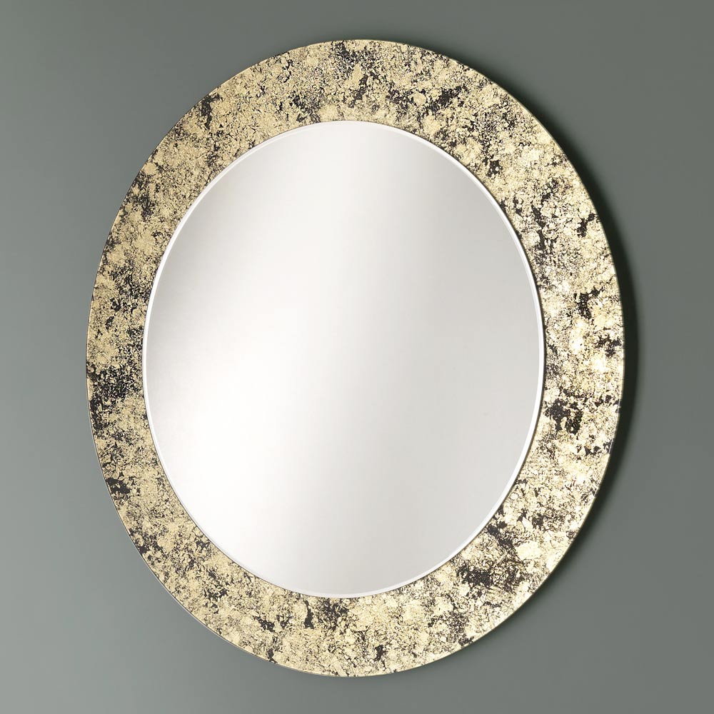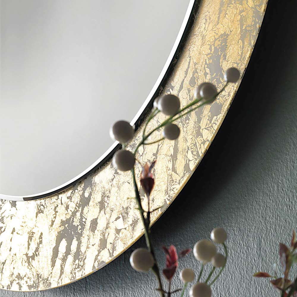 Dieser runde Wandspiegel zeichnet sich durch sein feines Design mit einem blattdekorierten Glasrahmen in vier verschiedenen und eleganten Ausführungen aus. Ideal für die Schaffung luxuriöser und raffinierter Atmosphären, passt es sich an verschiedene Kontexte an, um die Umgebung zu charakterisieren.