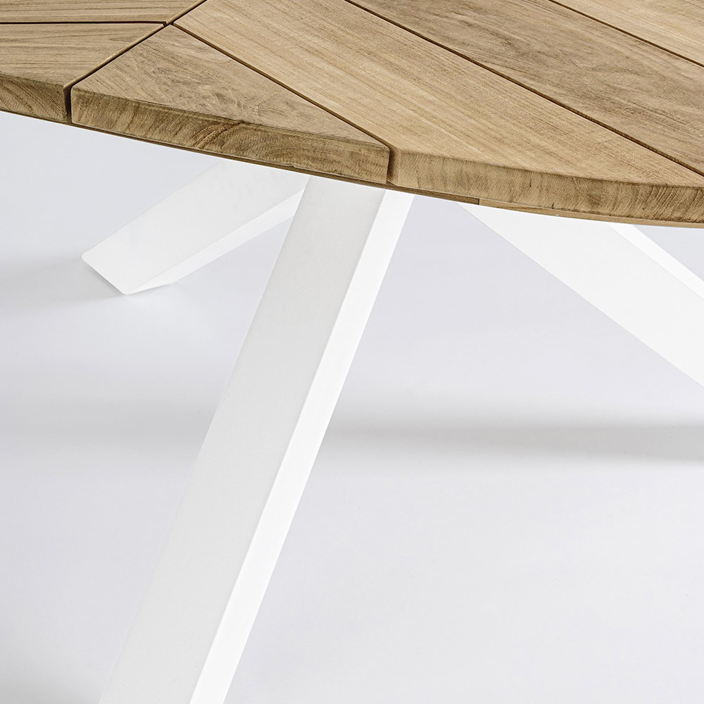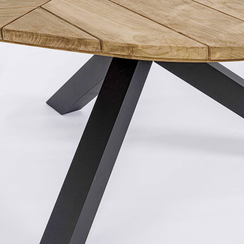 Runder Esstisch im Freien aus Aluminium mit Platte aus hochwertigem Teakholz.