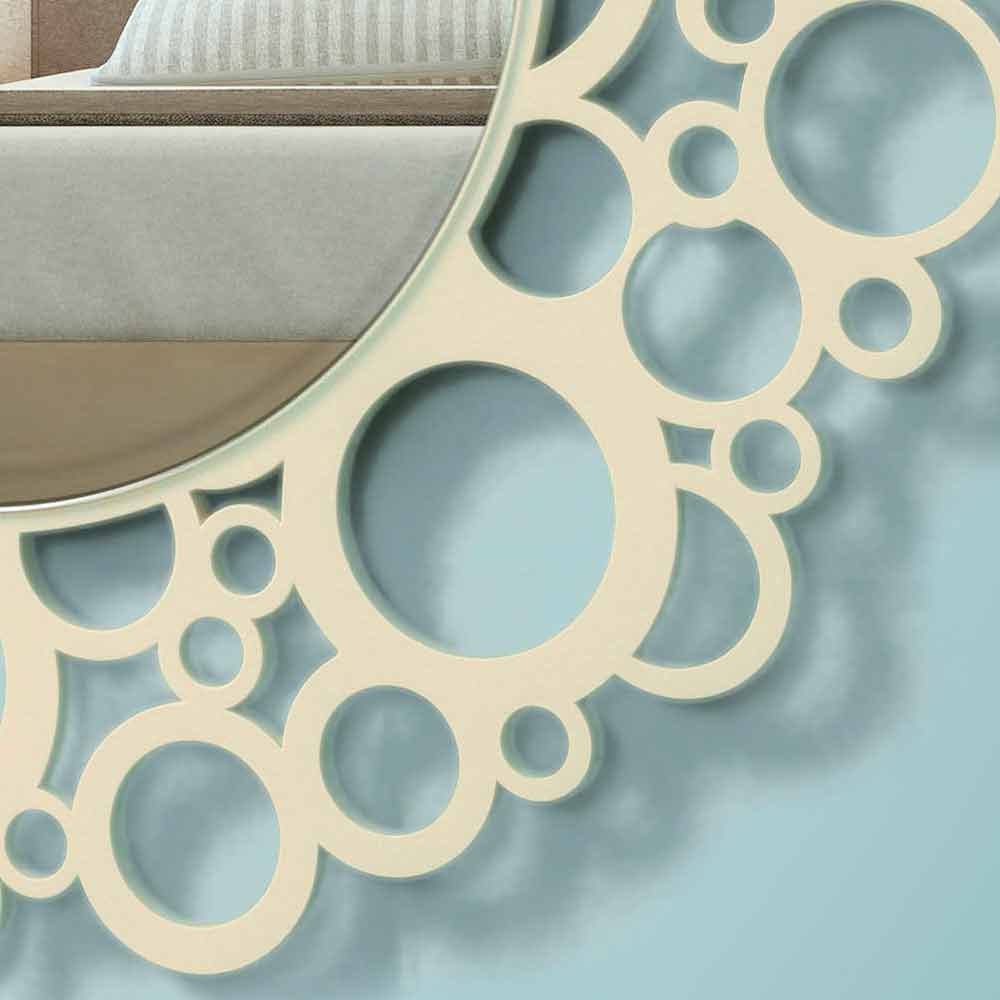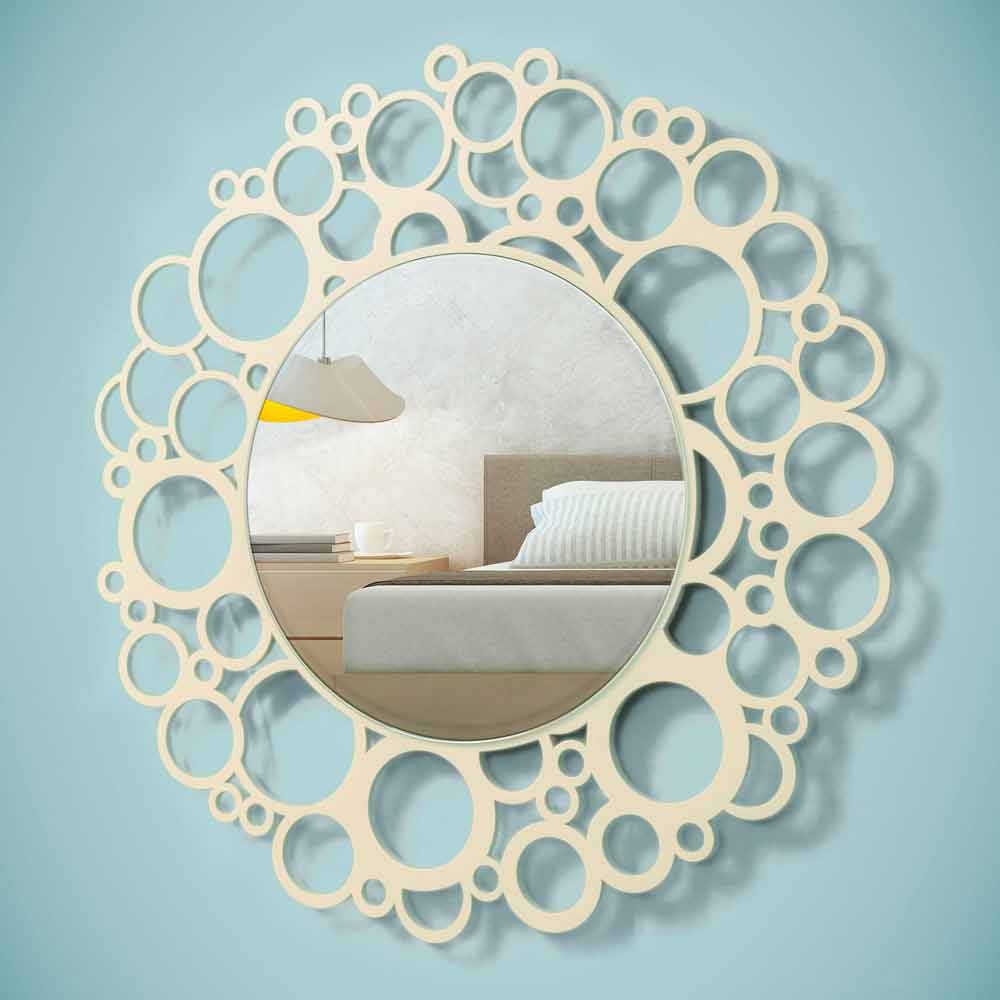 Kleiner runder Spiegel mit laserbearbeitetem lackiertem Holzrahmen . Es passt sich modernen Umgebungen mit minimalistischem Design an, z. B. Studios oder Arbeitsumgebungen.