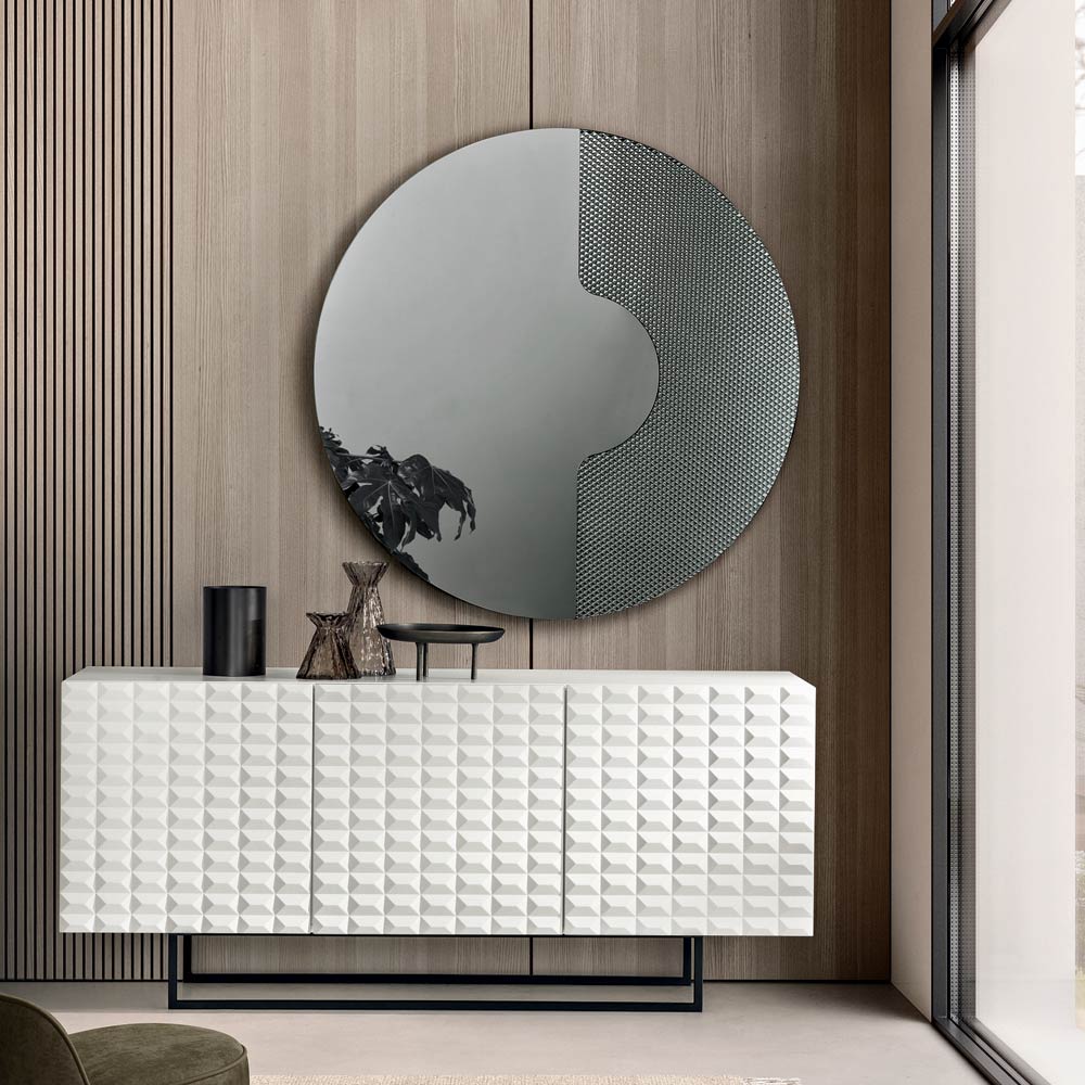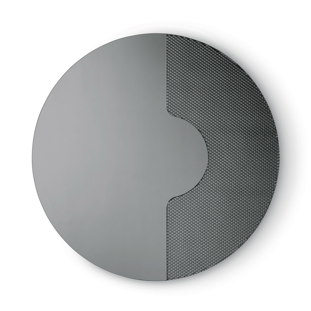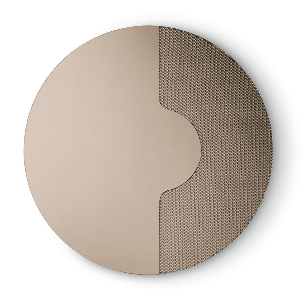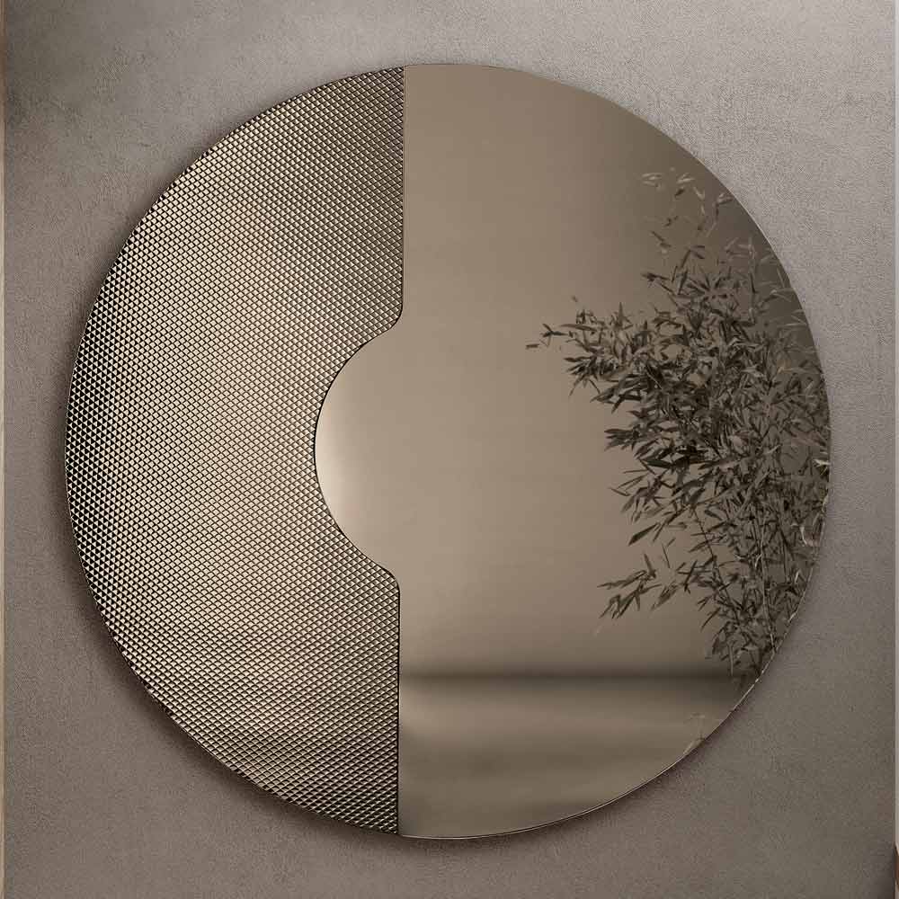 Der runde Spiegel verfügt über einen seitlichen Einsatz aus Ton-in-Ton-Glas mit eingraviertem grafischem Netzmuster . Dieses dekorative Element hält die Spiegelfläche, als ob sie darauf ruhen würde, und erzeugt so einen raffinierten dreidimensionalen Effekt sowie ein elegantes Zusammenspiel von Stärken und Spiegelungen.