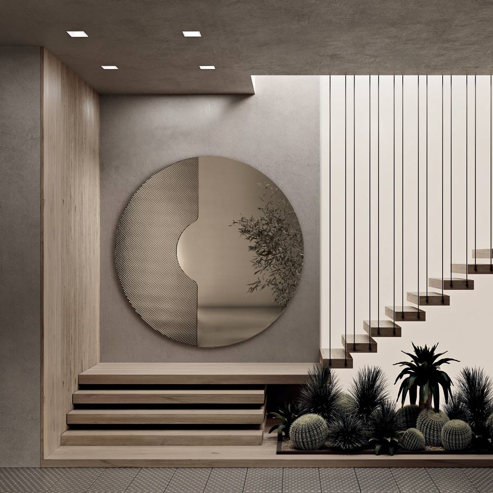 Dank der ausgewogenen Kombination aus Geometrie und Textur wird dieser Spiegel zu einem raffinierten Dekorationselement, das der Wand Tiefe und Helligkeit verleiht und sich perfekt in moderne und zeitgenössische Umgebungen einfügt.