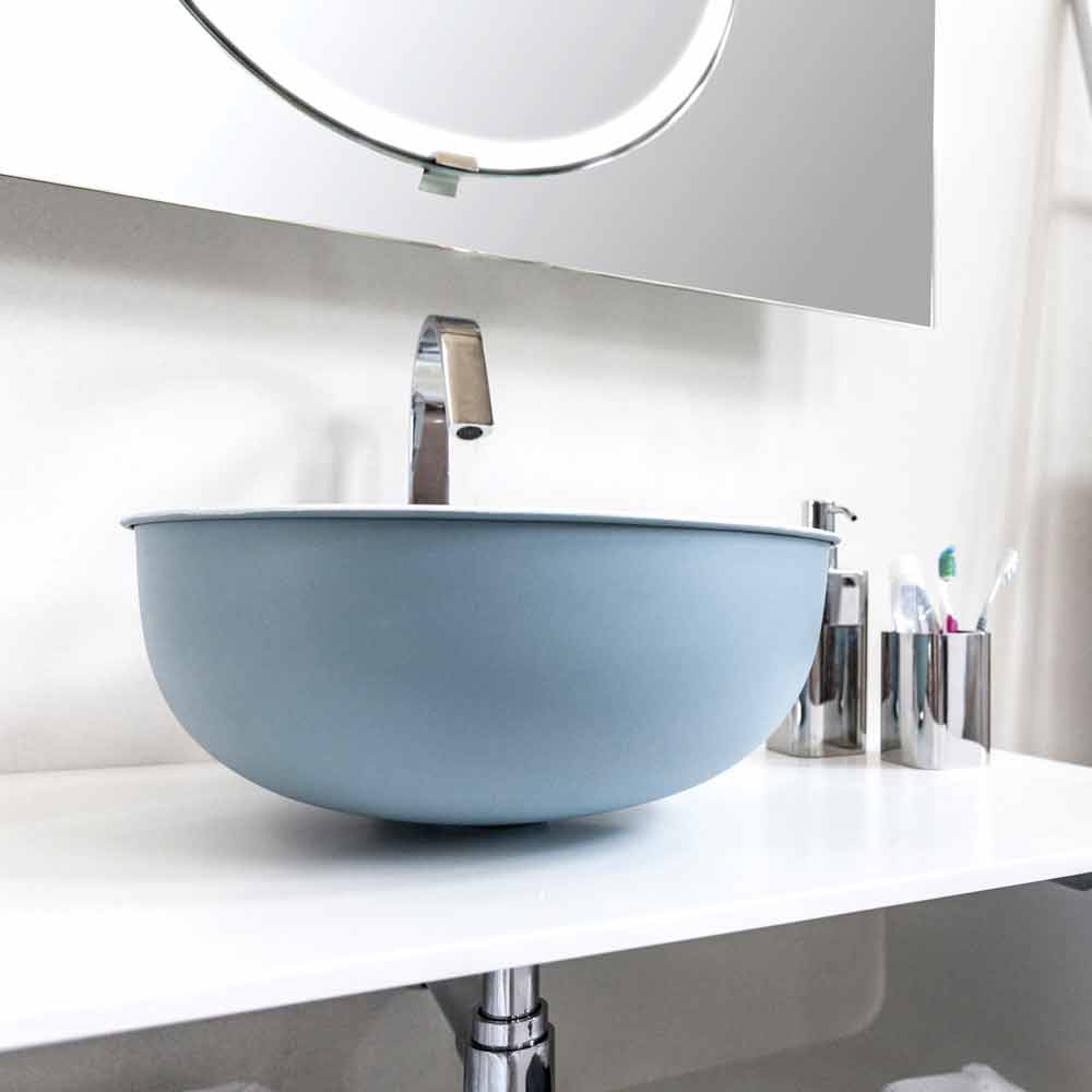 Modernes Aufsatzwaschbecken aus emailliertem Metall.