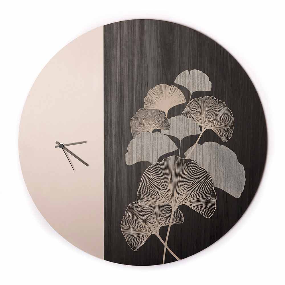 Rundes Design Holzwanduhr mit Dekorationen, 2 Oberflächen, Made in Italy - Ginkgo