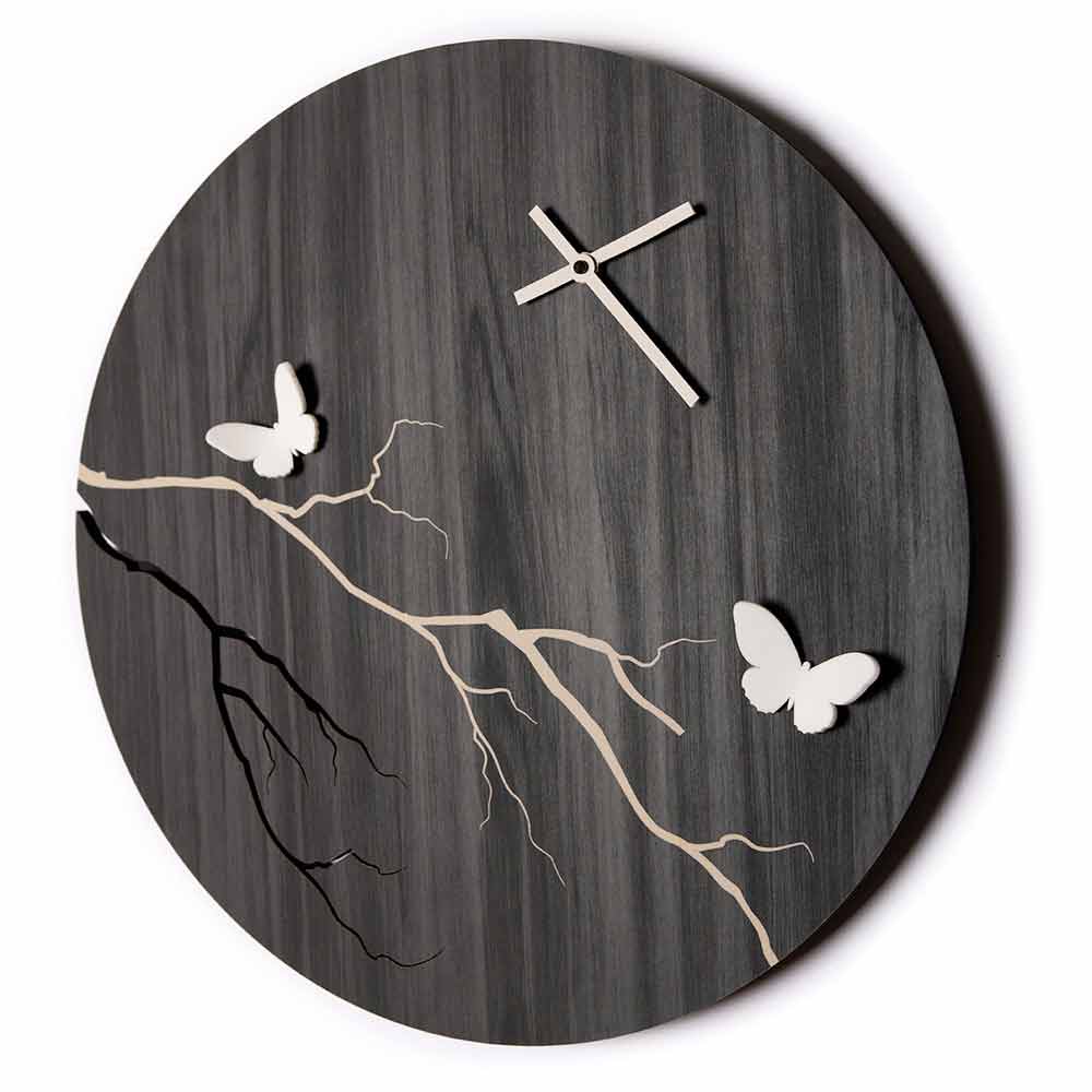 Runde Holzwanduhr mit lasergravierten Verzierungen und dreidimensionalen Schmetterlingen, hergestellt in Italien.