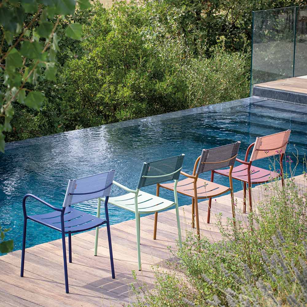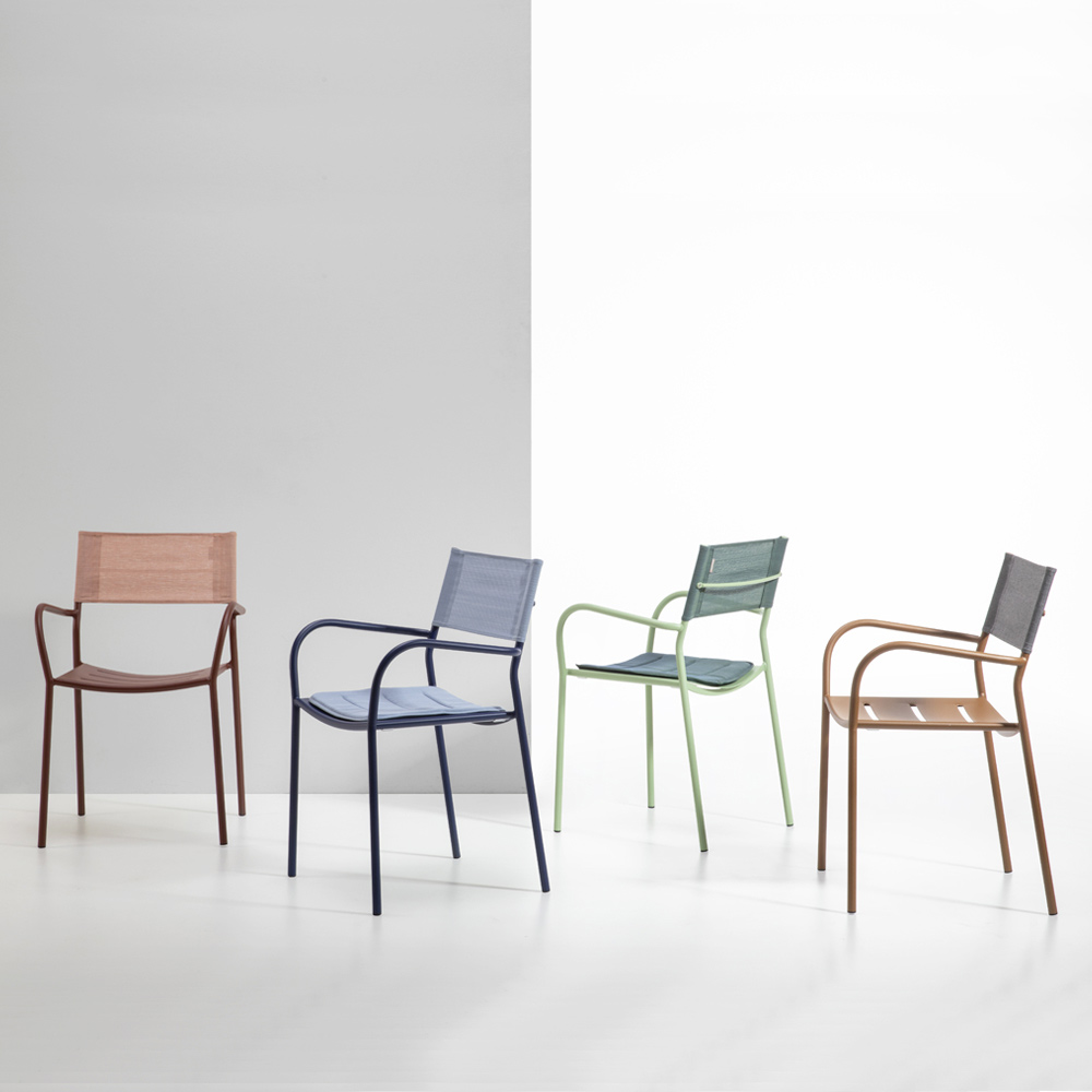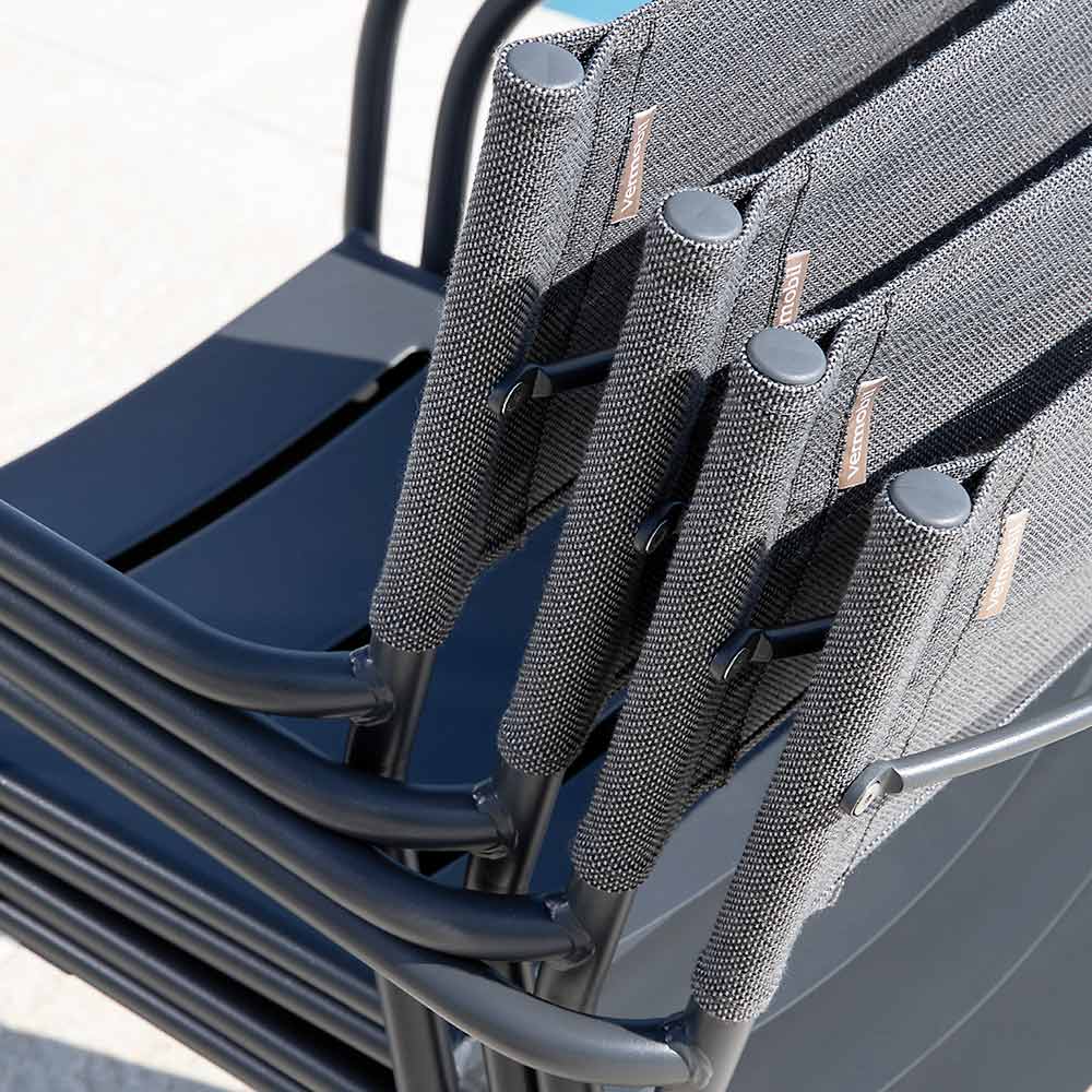 Die ergonomische Sitzfläche mit geschwungenen Linien sorgt für hervorragenden Halt und Komfort, während die atmungsaktive Batyline-Rückenlehne höchsten Komfort bietet, sich perfekt an die Körperform anpasst und die Luftzirkulation auch an den heißesten Tagen fördert. Die abgerundeten Armlehnen verleihen dem Stuhl einen Hauch von Raffinesse und machen ihn noch bequemer für angenehme Momente der Entspannung im Freien.