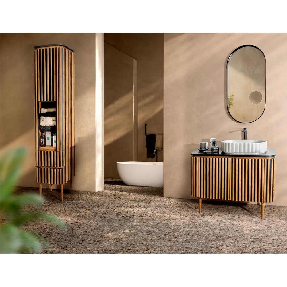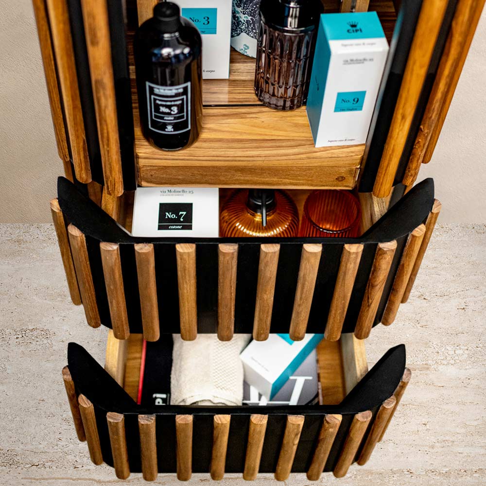 Dieser Säulen-Badezimmerschrank aus massivem Teakholz und Mahagoni ist mit seinen geschwungenen und glatten Formen ohne sichtbare Kanten oder Griffe ein Designjuwel. Die abgerundete Silhouette und der Verzicht auf überflüssige Details schaffen eine moderne und minimalistische Ästhetik, perfekt für eine moderne Badezimmerumgebung. Es bietet eine große, fast unsichtbare, langsam schließende Tür , die einen großzügigen Stauraum verbirgt, während der zentrale „offene“ Raum mit den beiden kostbaren Schubladen darunter verbunden ist. Die Verschmelzung von warmem Teakholz mit den satten Mahagoni-Tönen sorgt für einen natürlichen und edlen Touch .