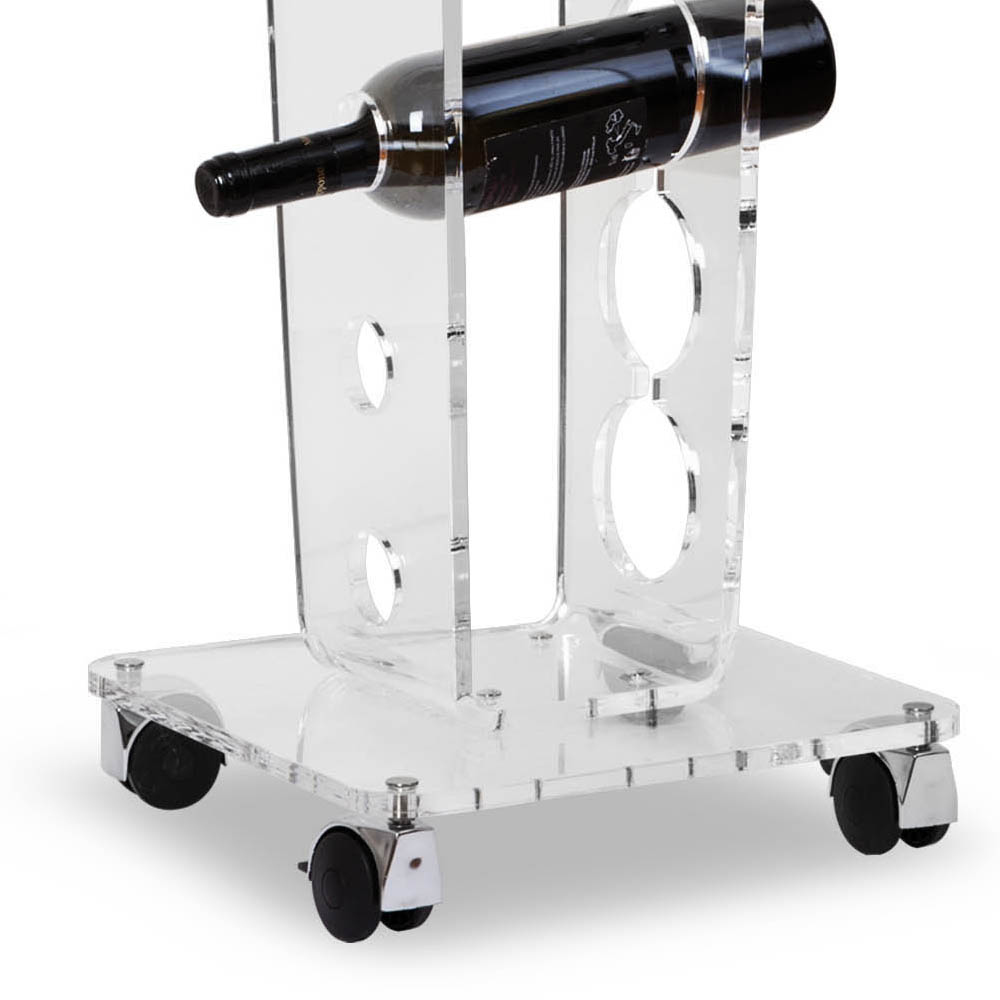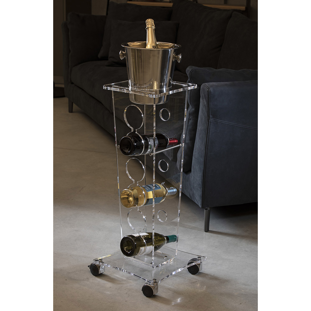Der freistehende Weinflaschenhalter zeichnet sich durch ein elegantes Design auf Rädern komplett aus transparentem Acrylglas aus. Elegant und funktional, kann es bis zu 6 Flaschen aufnehmen und endet mit dem Loch für den Eiskübel für ein komplettes Design.