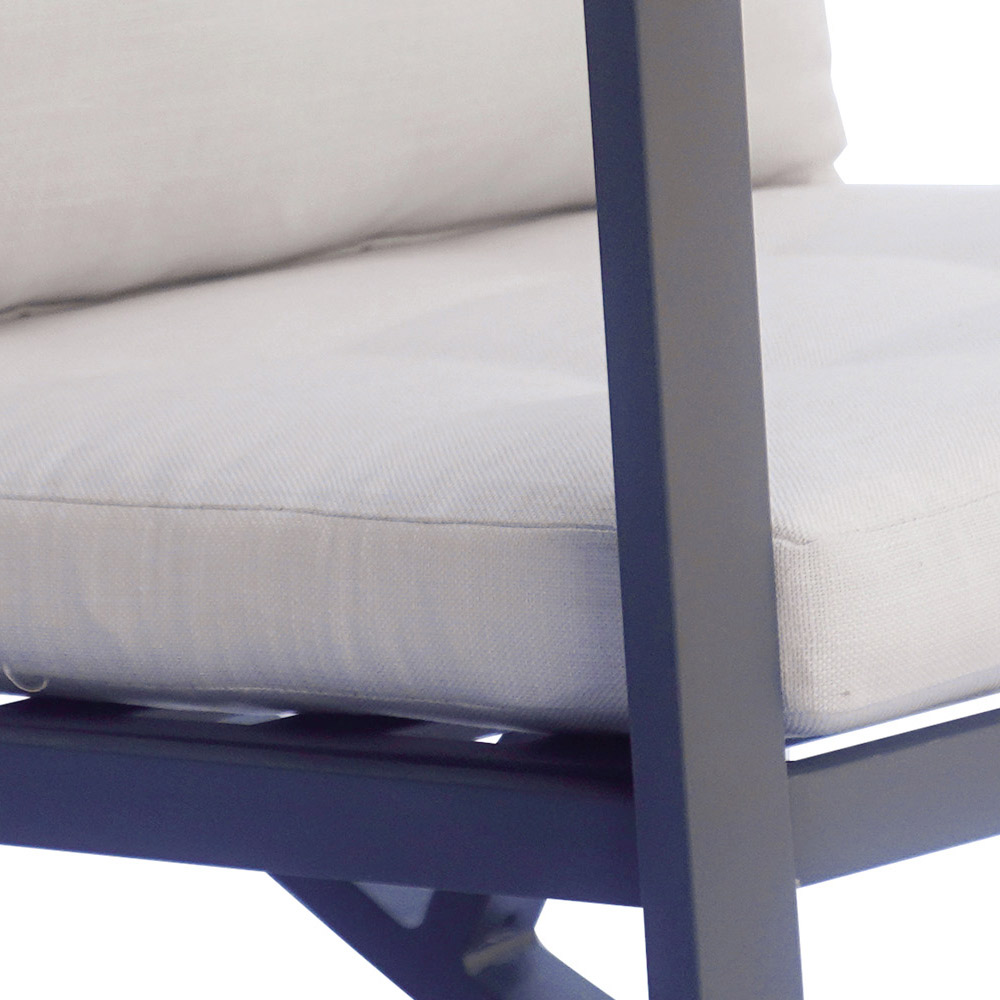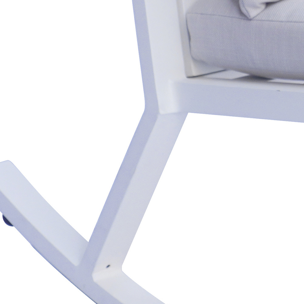 Bringen Sie mit diesem modernen Schaukelstuhl einen Hauch moderner Eleganz und anspruchsvoller Entspannung in Ihren Garten. Dieser Stuhl wurde entworfen, um Stil und Komfort zu vereinen. Er ist mit einem stabilen Aluminiumrahmen ausgestattet, der Langlebigkeit und einfache Wartung gewährleistet. Das minimalistische Design wird mit dicken, weichen Kissen kombiniert, die überragenden Komfort und ausreichend Unterstützung für lange Entspannungsphasen bieten.