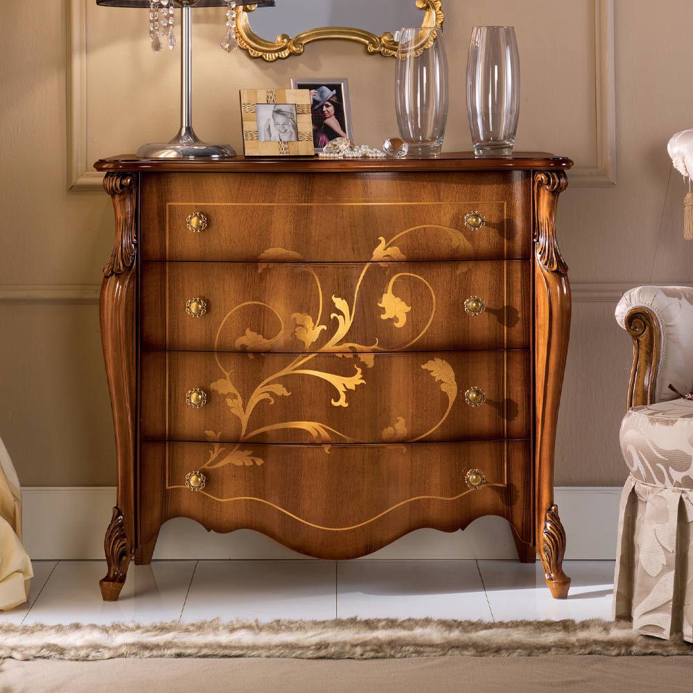 Kommode im klassischen Stil aus Bassano Nussbaumholz mit 4 praktischen und geräumigen Schubladen und eleganten Intarsien. Eine einzigartige und raffinierte Ergänzung, die vollständig in Italien von erfahrenen Handwerksmeistern hergestellt wird, Meister der Kunst, die jede Ergänzung mit Weisheit und Geschmack für Eleganz vervollständigen. Die Produktion erfolgt unter Verwendung hochwertiger Materialien und mit der größten Sorgfalt und Professionalität, die die Produkte Made in Italyauszeichnet .
