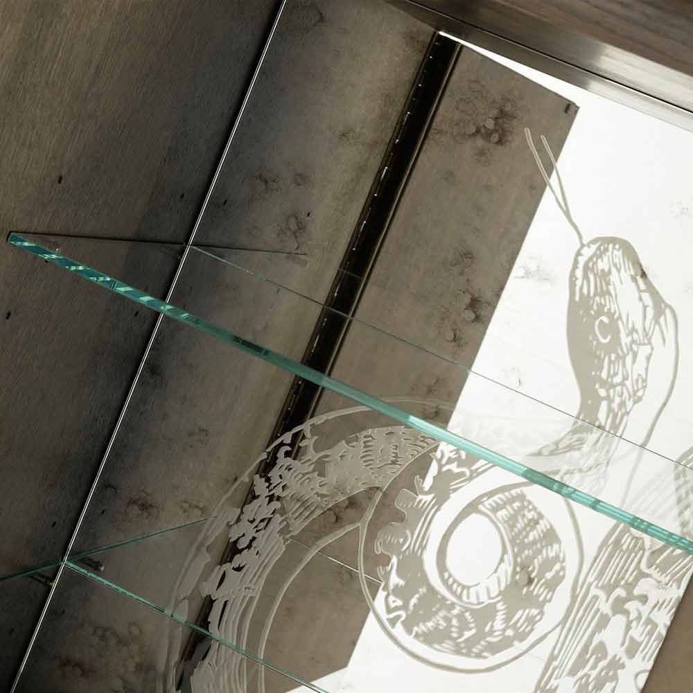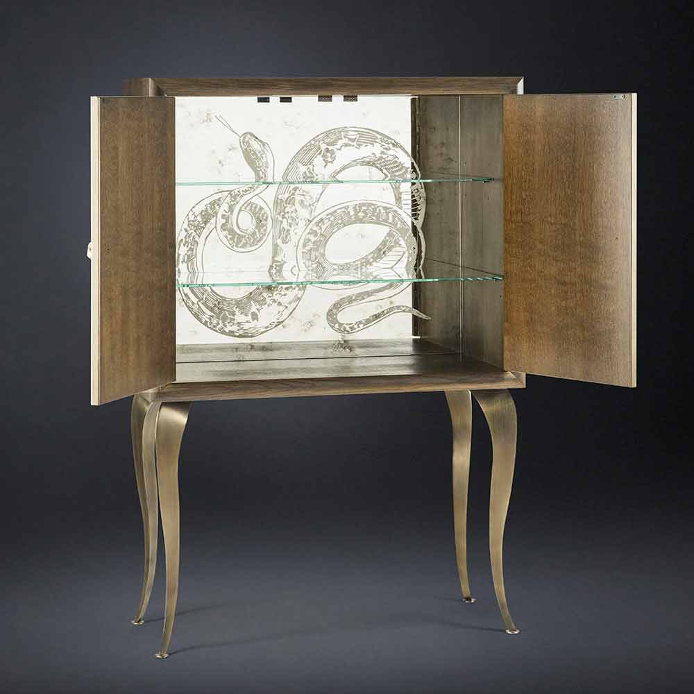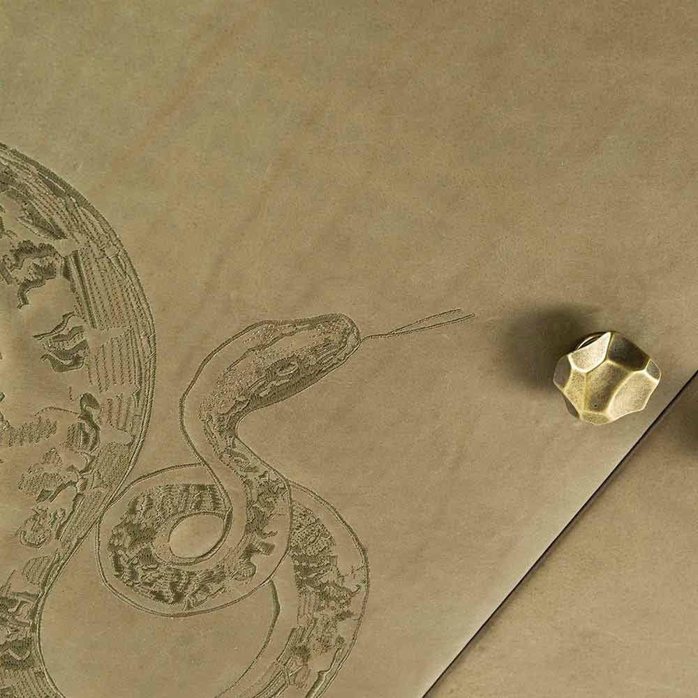 Schrank Joy mit 2 Türen, aus Massivholz und Anilinleder. Designerschrank mit modernem und elegantem Design. Joy ist Teil der Original Sin Collection von Giorgio Ragazzini. Joy besteht aus massivem Eichenholz mit Metallbeinen in patiniertem Messingfinish und verstellbaren Füßen. Die beiden Türen sind mit Elite-Anilinleder bezogen, während sich im Inneren zwei Glasböden befinden. Die Schlange des Gartens Eden, das Symbol der gesamten Kollektion, ist auf die Schranktür und auf die Innenseite gestickt.