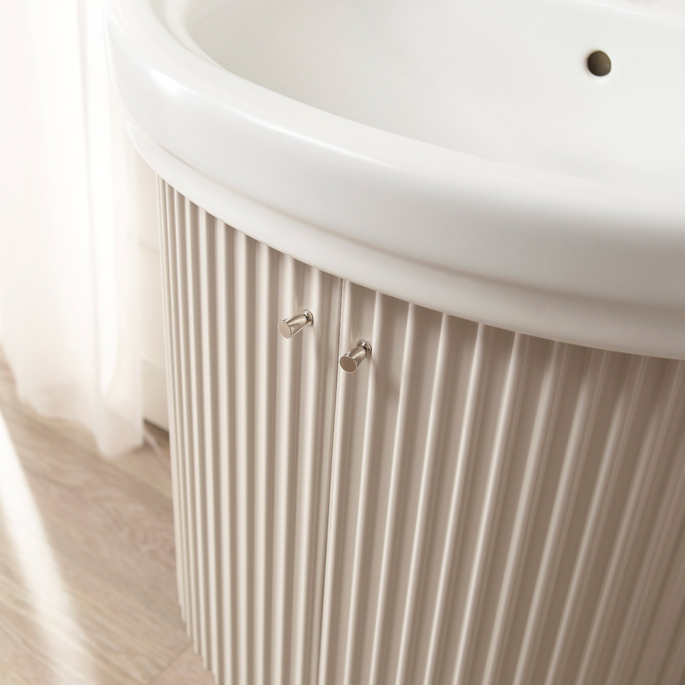 Badezimmerschrank aus MDF mit zwei Türen in Cannetté -Verarbeitung , mattes Finish, ein Regal aus MDF Idro, komplett mit Keramikwaschbecken und Nickelknöpfen , inklusive mattweißer MDF-Beine .