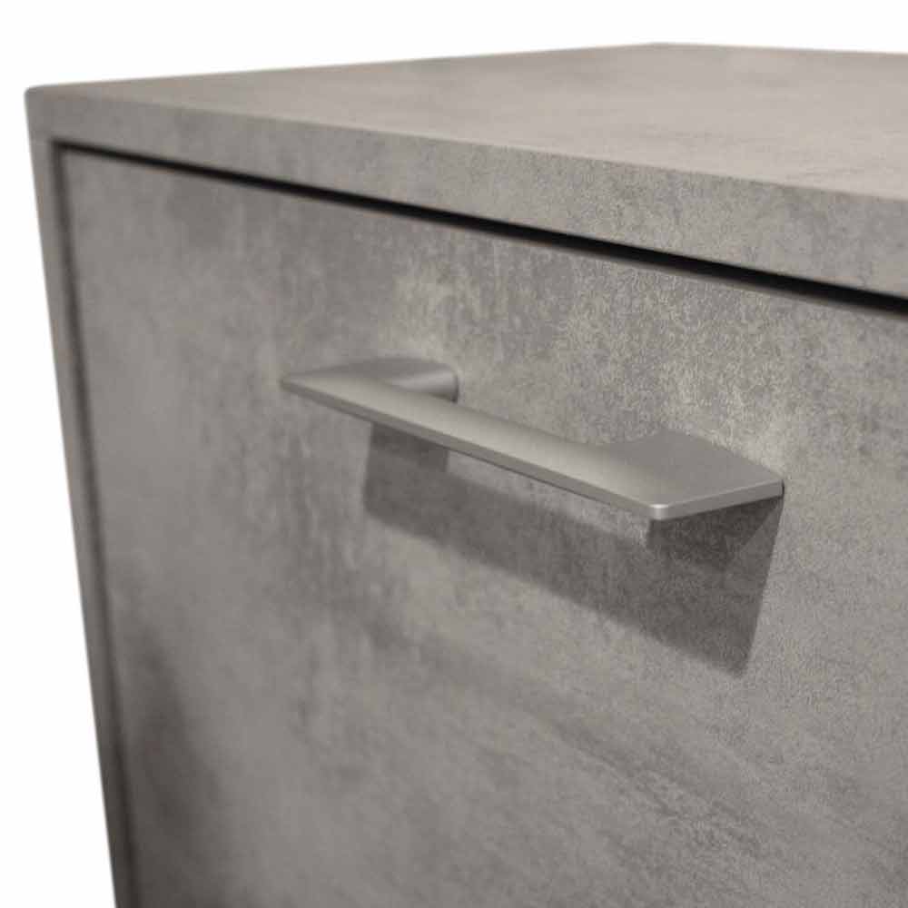Der Schuhschrank ist aus melaminbeschichteten Spanplatten hergestellt in der Auführung Zement.
