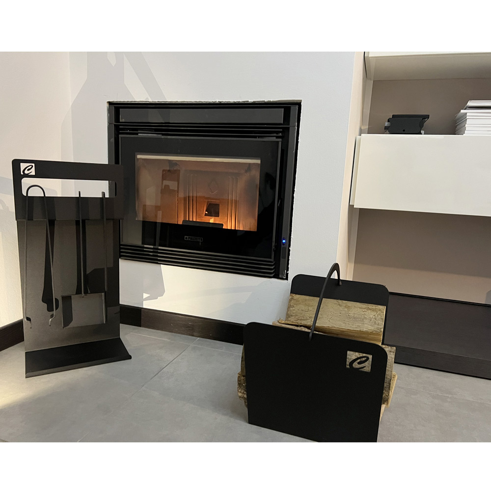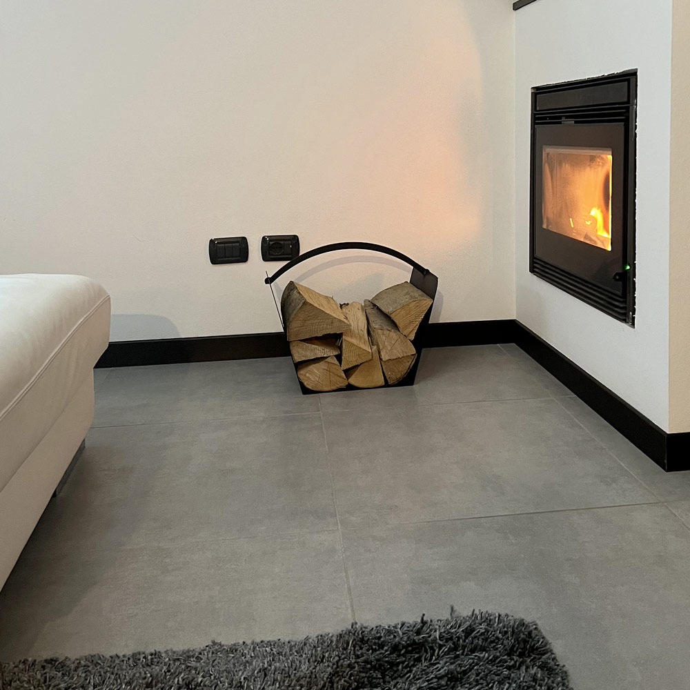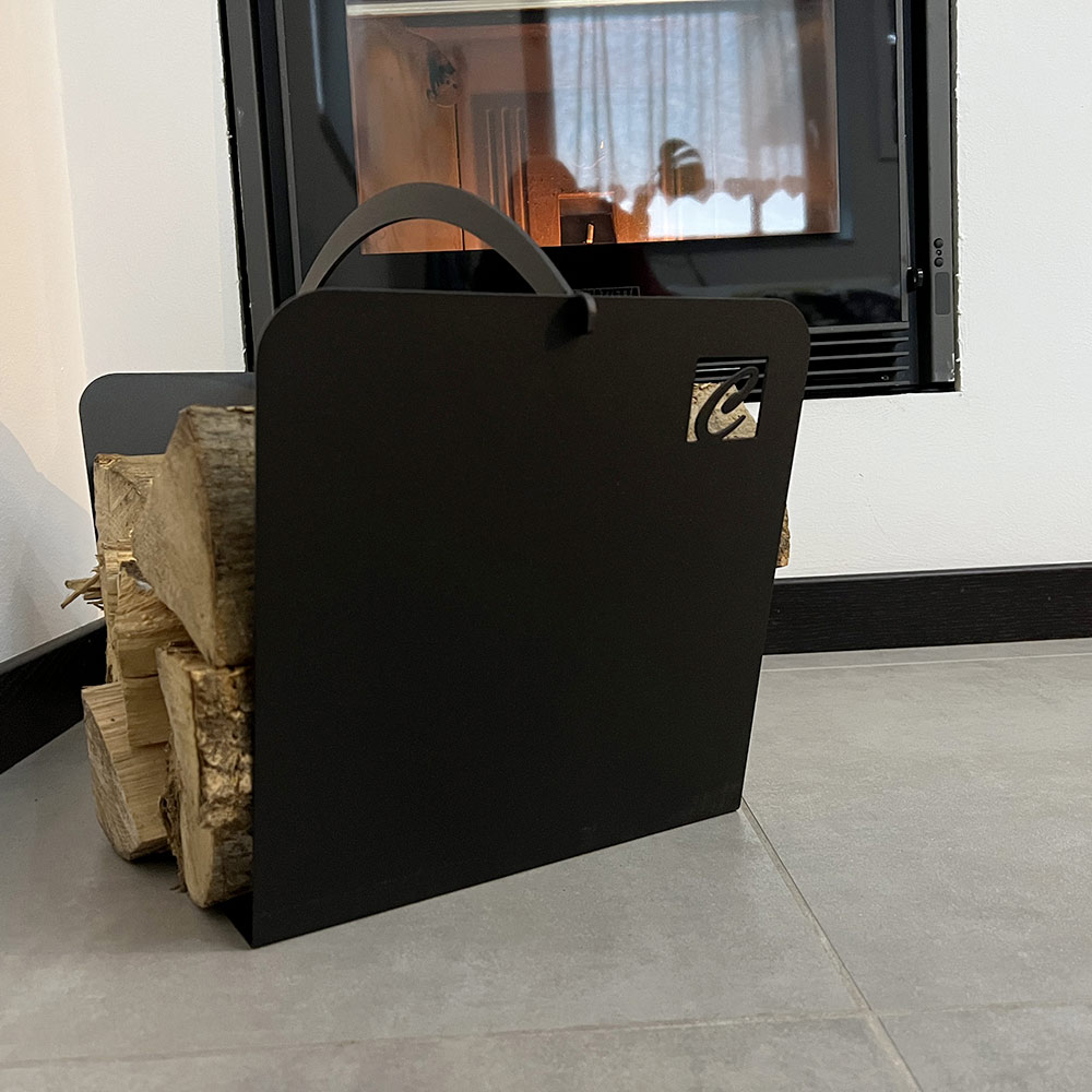 Moderner und minimalistischer Blockhalter für Innenkamin aus schwarzem Stahl, hergestellt in Italien.