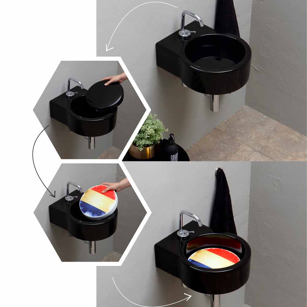 Modernes Aufsatz- / Hängewaschbecken, hergestellt in Italien Tor Tor ist das schlichte Waschbecken mit vielseitigem Design, das sich dank der zahlreichen Oberflächen der Platte an alle Geschmäcker und ästhetischen Bedürfnisse der Räume anpassen lässt. Die Platte ist abnehmbar und in den folgenden Ausführungen erhältlich: - Schwarz; - mit der Flagge Brasiliens; - mit der Flagge Kanadas; - mit der Flagge der Schweiz; - mit der Flagge Deutschlands; - mit der Flagge von Frankreich; - mit der Flagge Italiens; - mit der Flagge Norwegens; - mit der Flagge von Schweden; - mit der Flagge des Vereinigten Königreichs; - mit der Flagge der Vereinigten Staaten von Amerika.