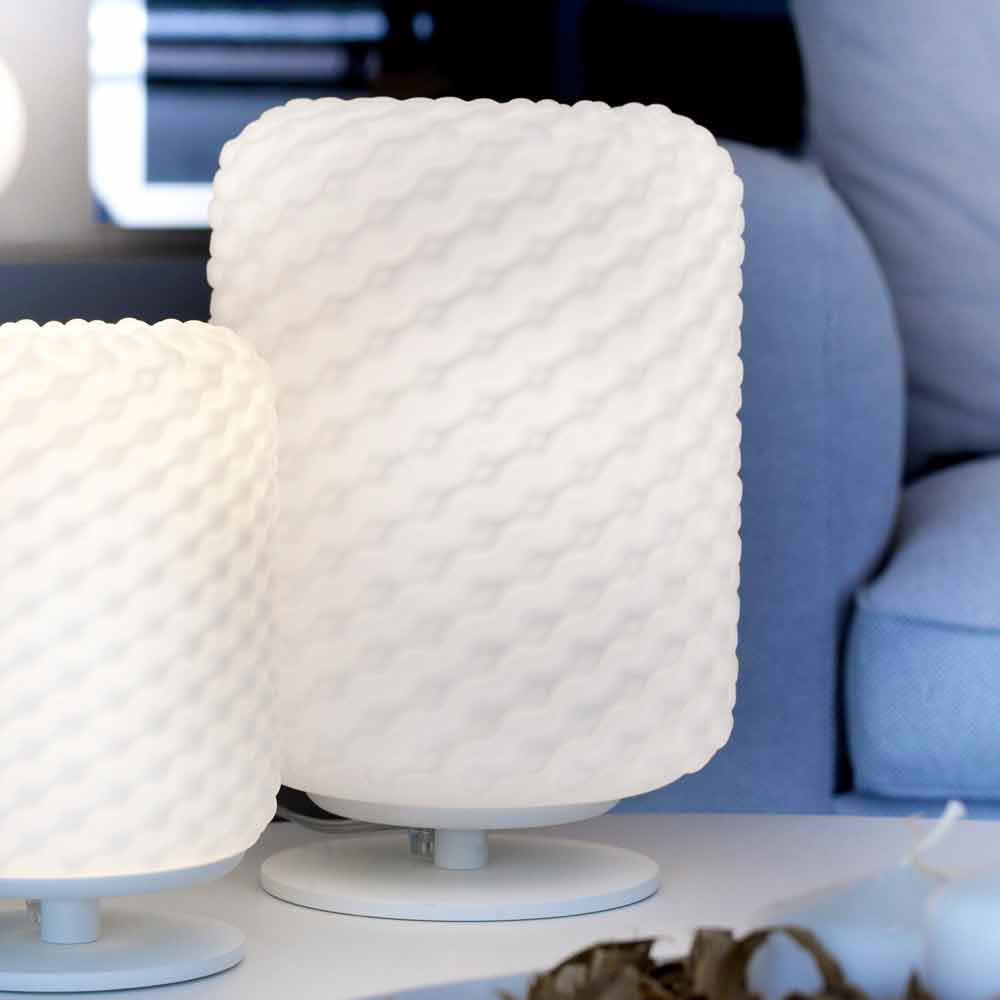 Domino ist eine reichhaltige Kollektion von Lampen aus mundgeblasenem Glas mit einer speziellen alveolaren Prägung, die das Glas selbst verschönert. Der Diffusor kann zylindrisch in zwei Größen und kugelförmig in einem sein, außerdem ist er in zwei satinierten Farben erhältlich: weiß und amber; und für den Einsatz einer 42W E27 Lampe vorbereitet.
