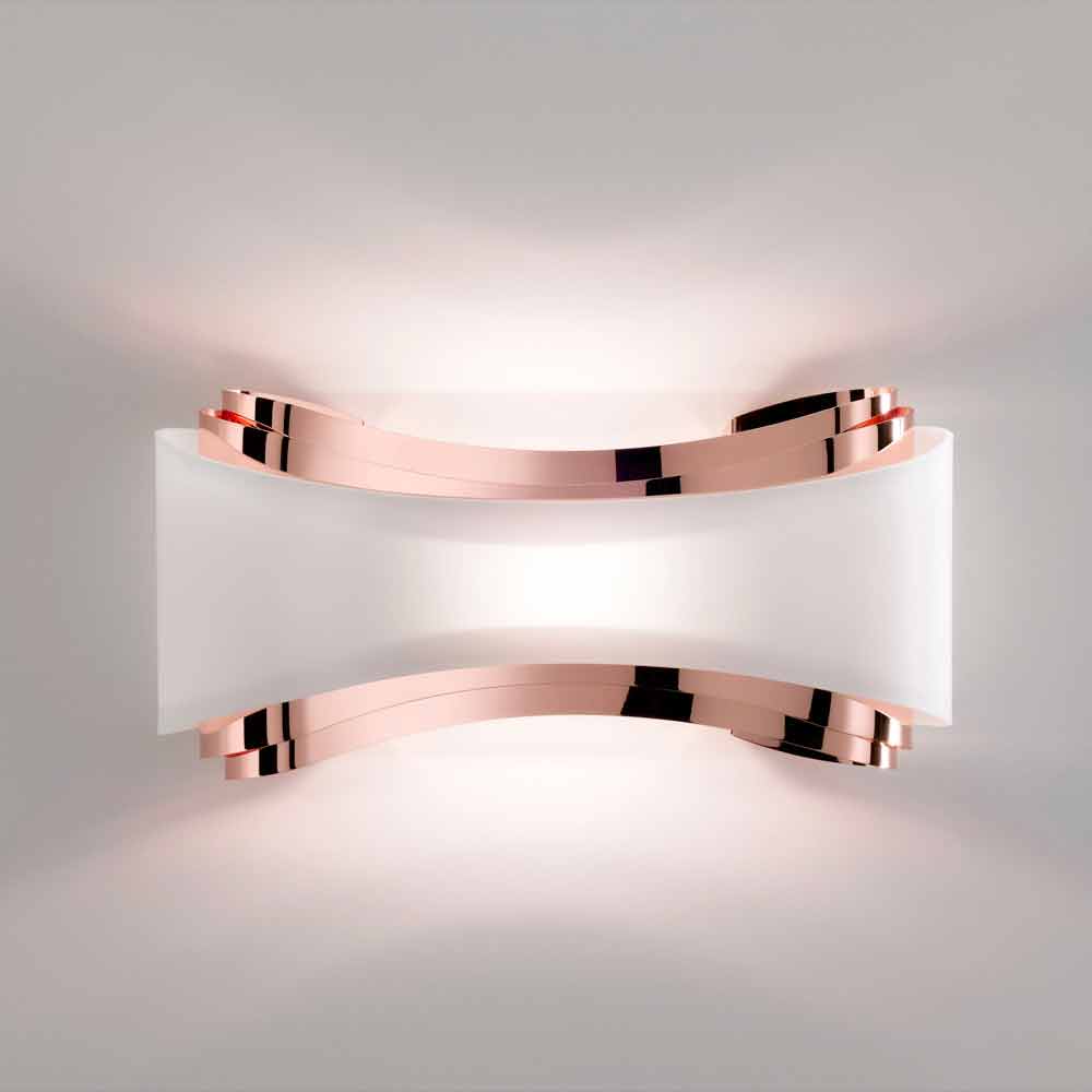 Selene Ionica handgefertigte Stahl und Glasapplikation 43x12 H 20cm Ionica ist eine Lampe aus Stahlbändern, die geschickt von Hand gebogen wird, um eine flüssige und zusammengesetzte Form zu schaffen. Vollenden: Kupfer. Beleuchtet von normalen Glühbirnen oder LEDs. NB die Birnen sind nicht enthalten.