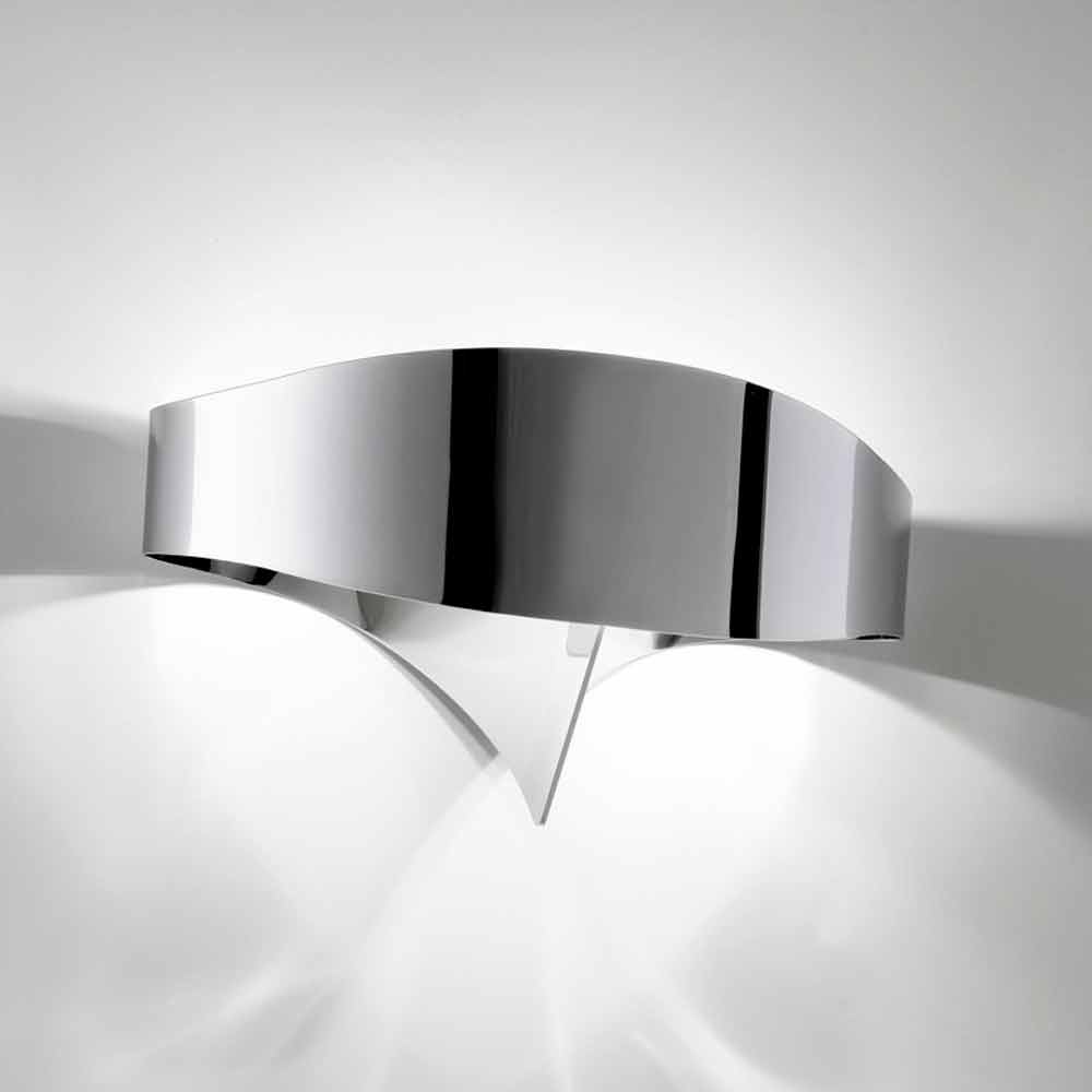 Moderner Entwurf der galvanischen Wand der Selene Scudo, hergestellt in Italien Scudo ist eine Wandleuchte, die aus einem laserförmigen Stahlband entsteht, das von Hand zu einem ungeteilten und umhüllenden Element gefaltet wird. Erhältlich in verschiedenen Ausführungen und vorbereitet für den Einsatz mit 2 G9 42 W Glühbirnen oder 1x11W LED.