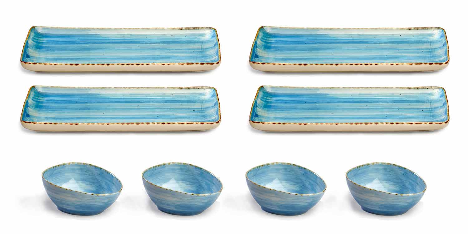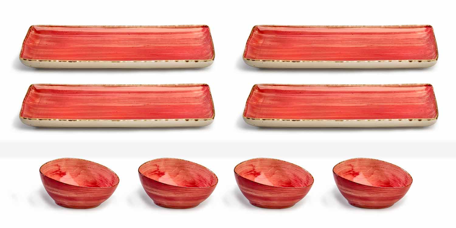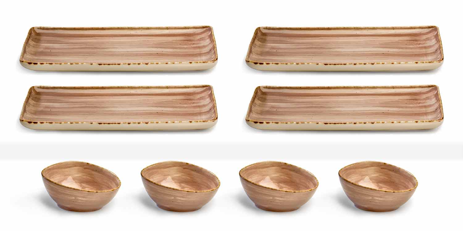 Serviert moderne und vielseitige Gerichte, 4 runde Schalen und 4 rechteckige Teller aus farbigem Steinzeug.