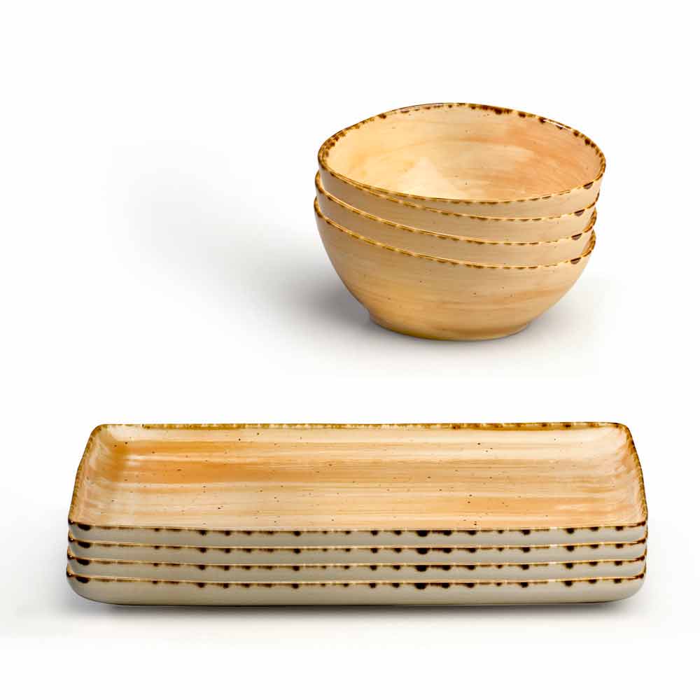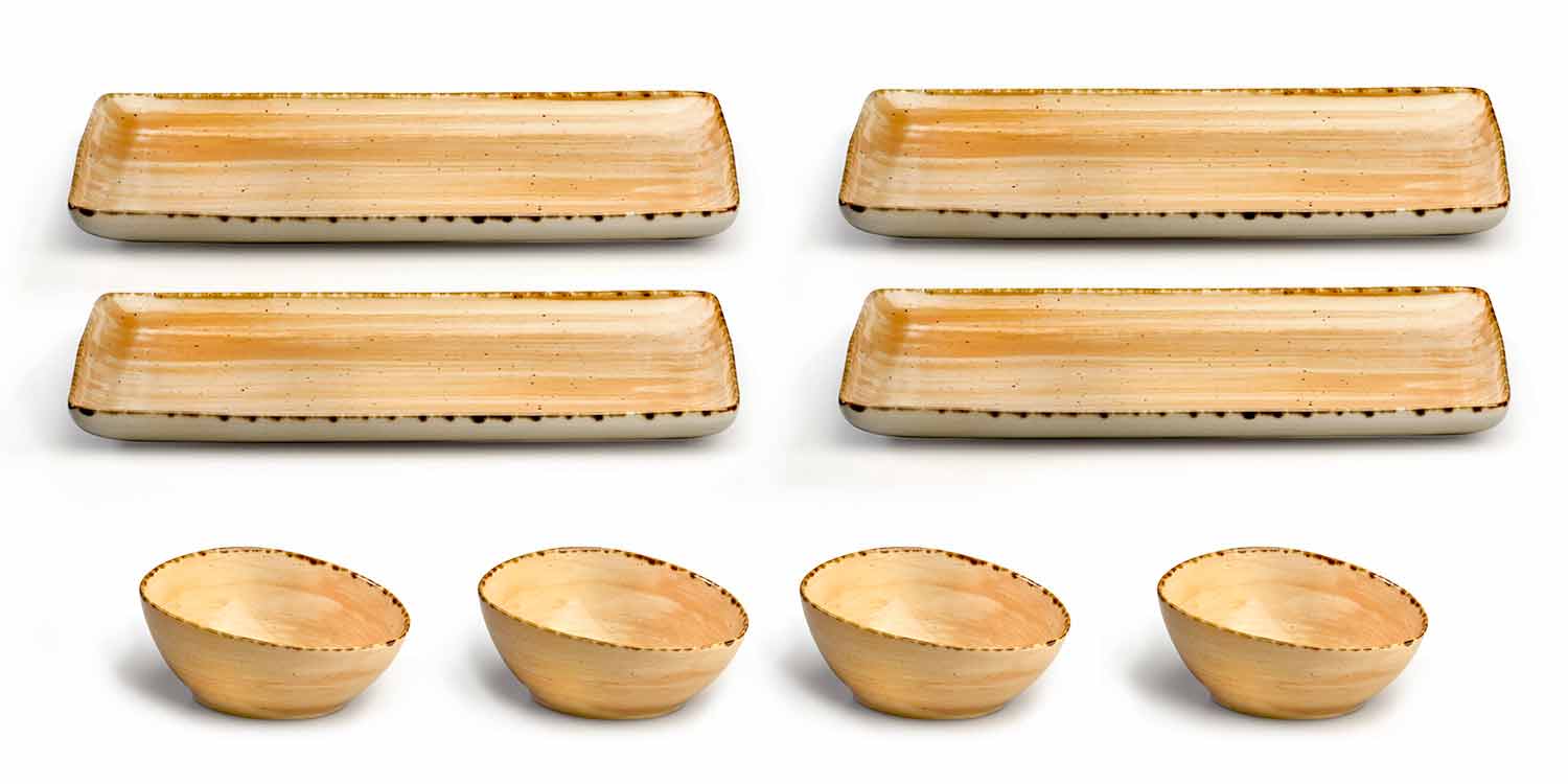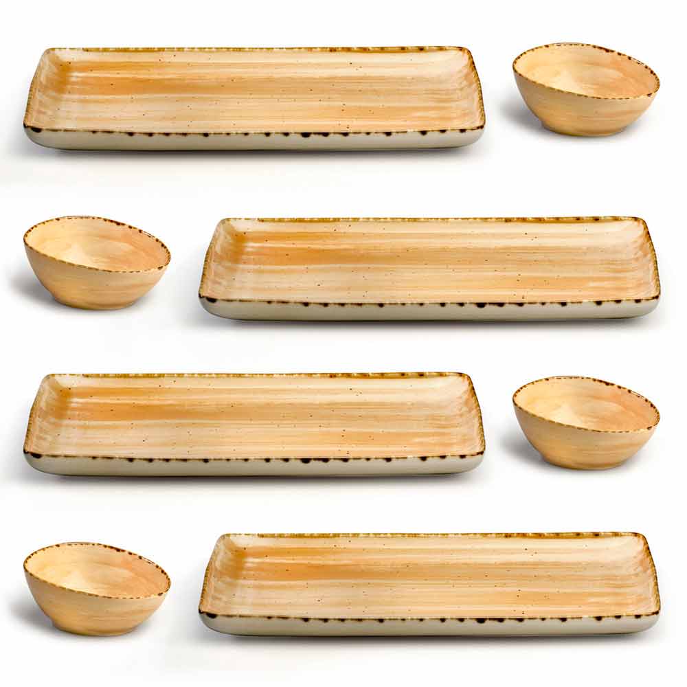 Serviert moderne und vielseitige Gerichte, 4 runde Schalen und 4 rechteckige Teller aus farbigem Steinzeug.