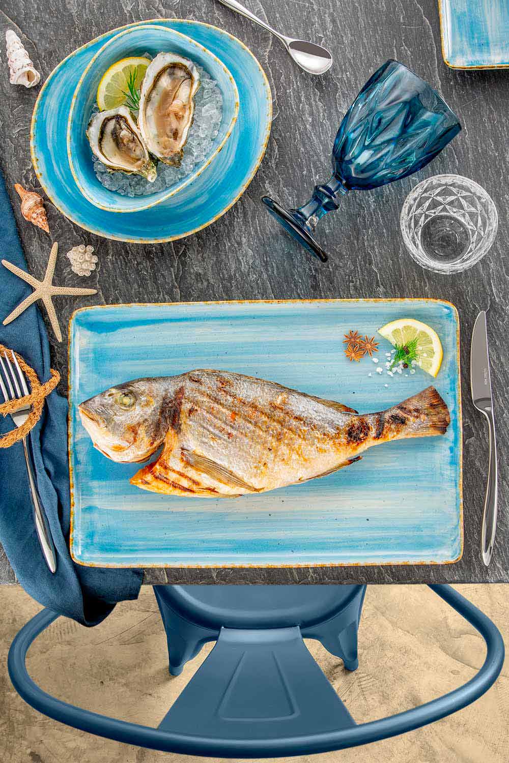 Anisblau : Die Farbe des Ozeans und die Meeresbrise, die sich mit der Unermesslichkeit des Himmels verbindet, für einen Mise en Place, der leckere Ideen in der Küche überraschen und hervorheben möchte.