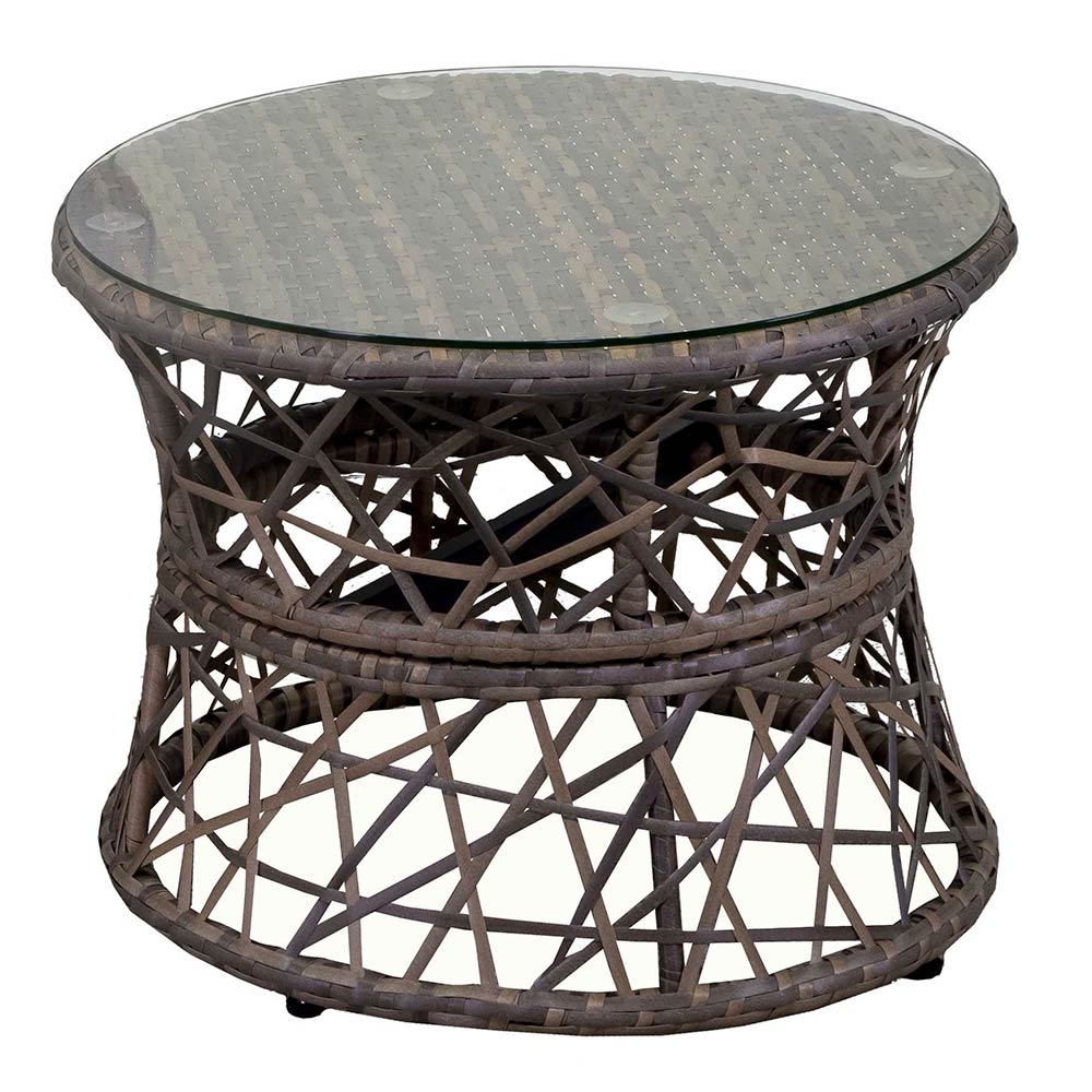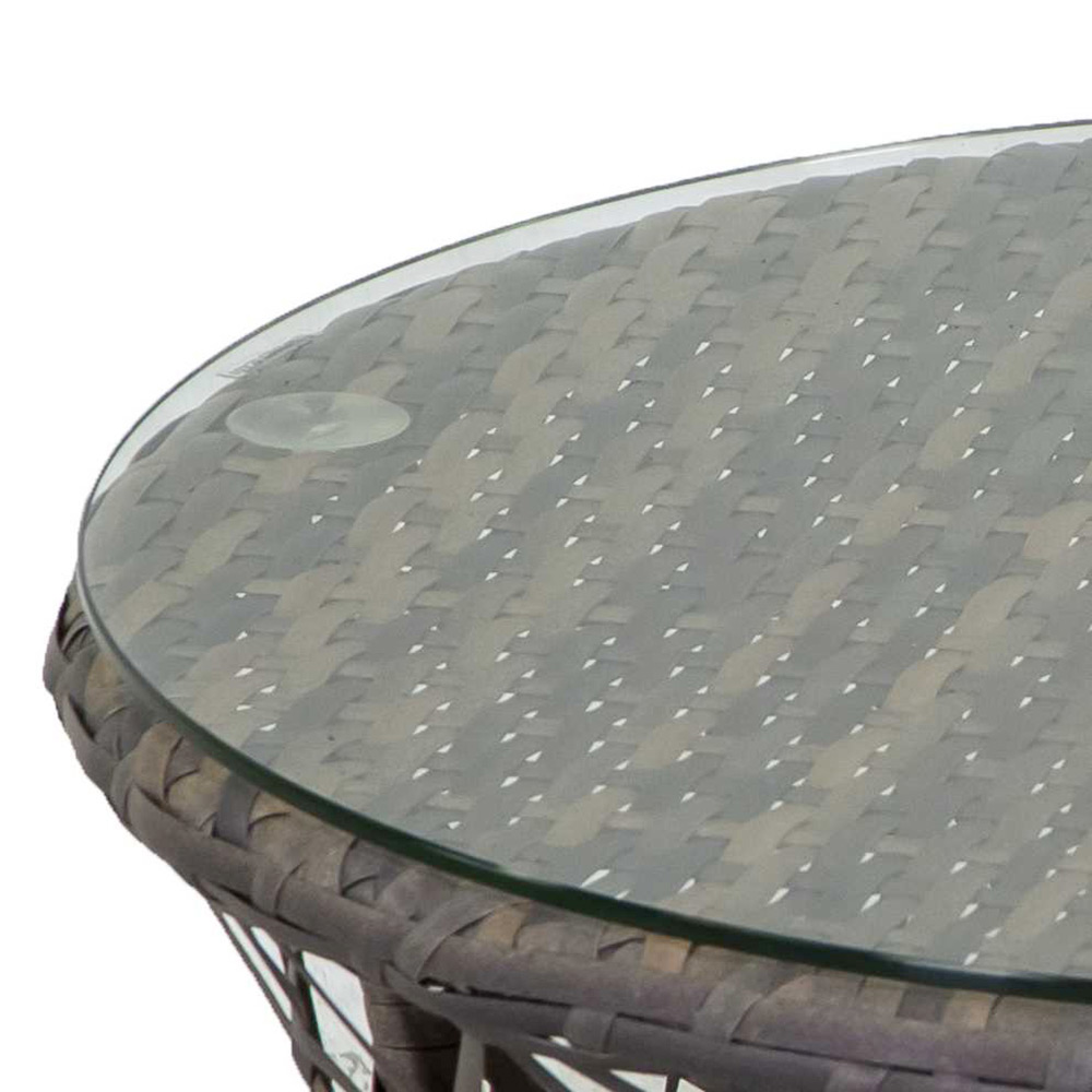 Der passende Kaffeetisch verfügt über eine Glasplatte, ideal um Getränke, Bücher oder Dekorationen in Reichweite zu halten. Seine runde Form und kompakte Größe machen ihn vielseitig einsetzbar und leicht neben dem Sessel oder in jeder Ecke des Gartens oder der Terrasse zu platzieren.