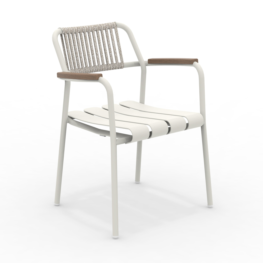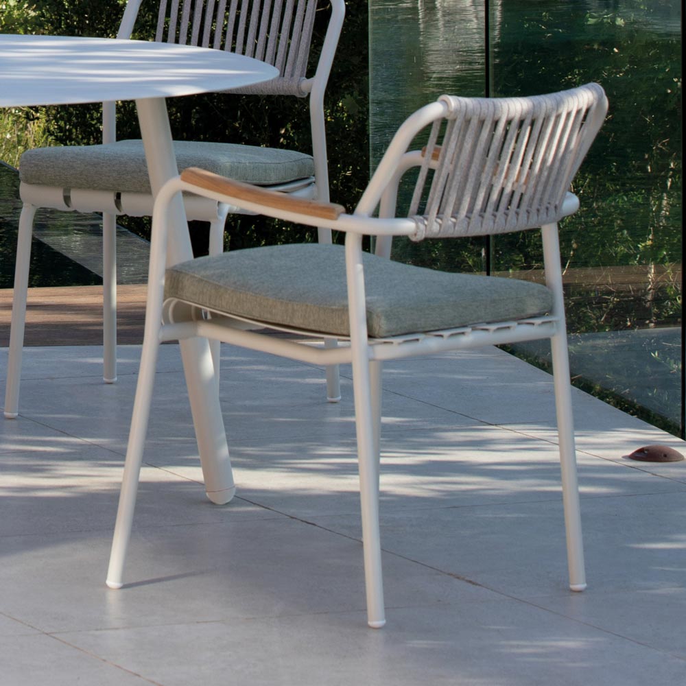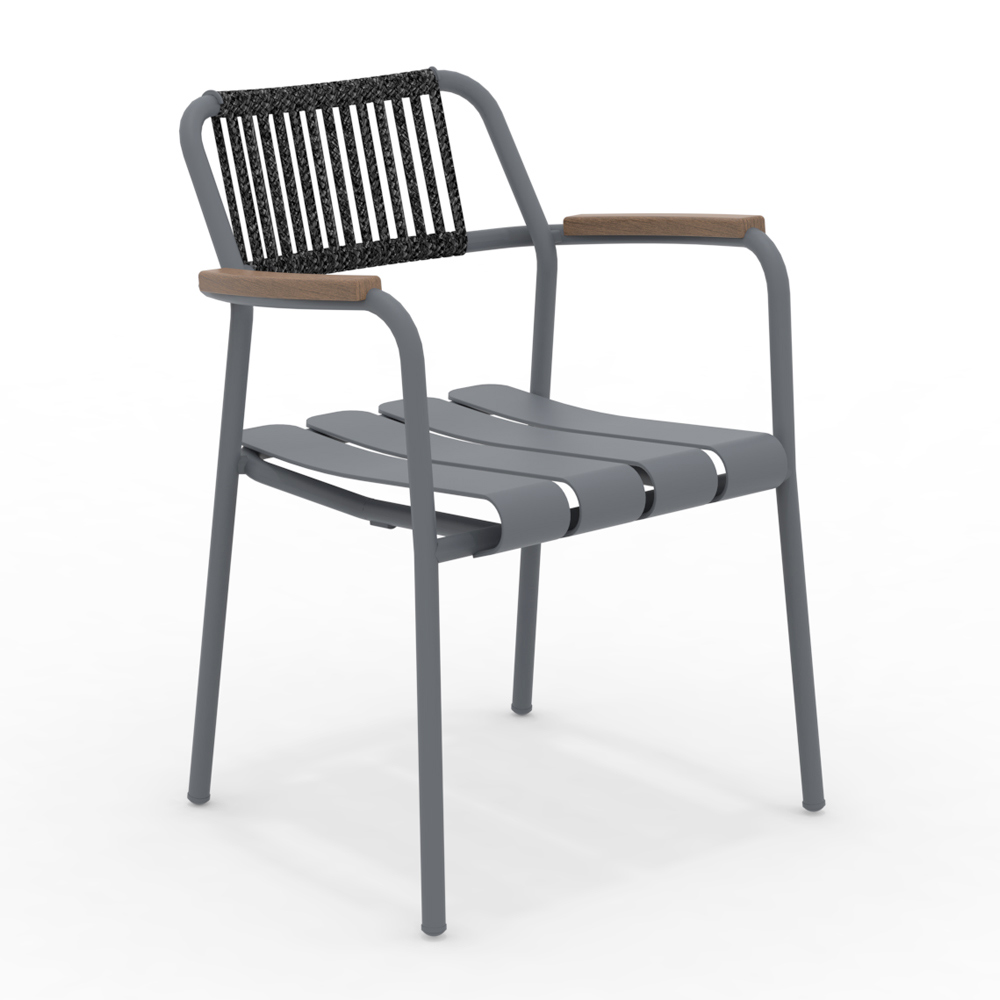 2 Outdoor-Sessel mit Aluminiumrahmen, Armlehnen aus FSC-Teakholz und Seilrückenlehne.
