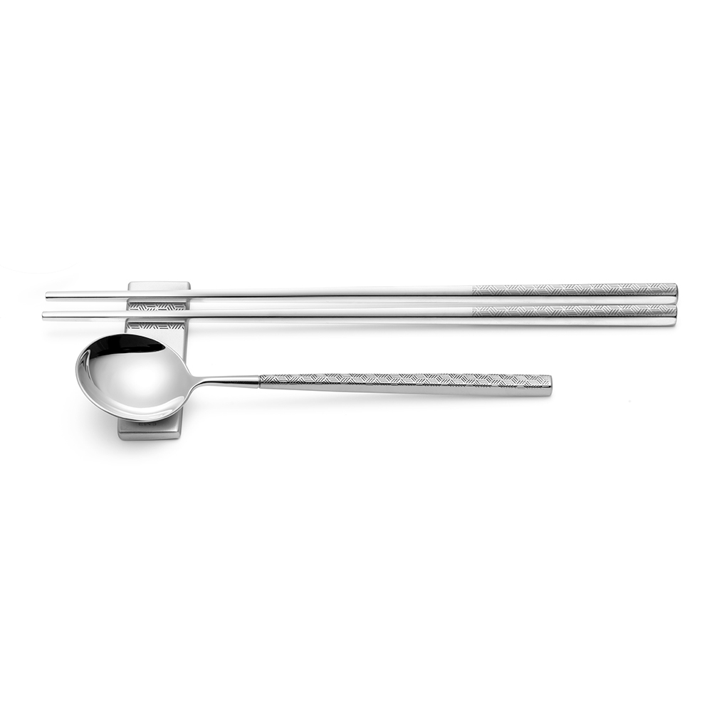 Die langen, schlanken Stäbchen sind für bequemes Benutzen und sicheren Halt konzipiert, während der Löffel eine optimale Tiefe hat, um mühelos Brühen und Soßen zu schlürfen. Das markante Element ist die quadratische Basis, die als Ablage für das Besteck dient und dafür sorgt, dass es immer sauber und gut präsentiert bleibt, wenn es nicht verwendet wird.