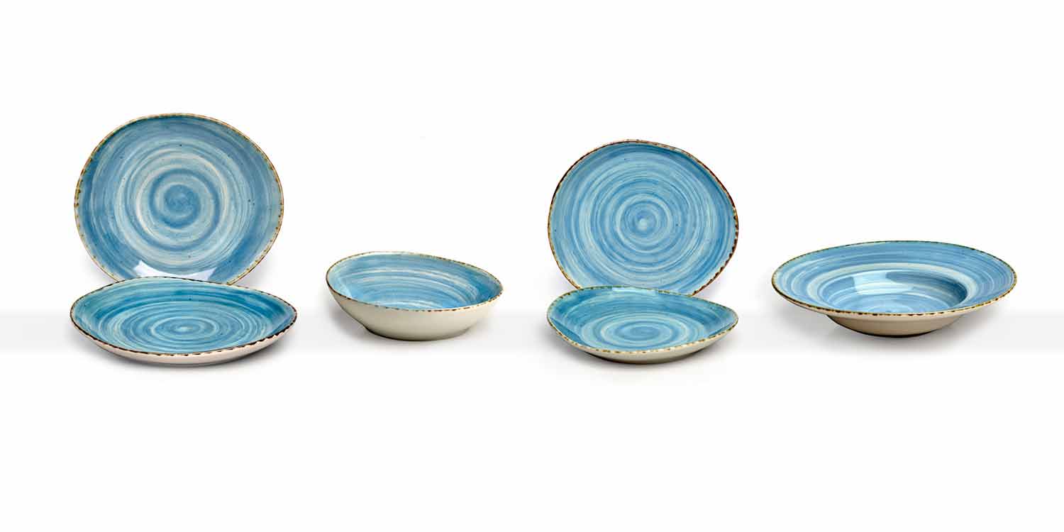 Originalität : Die unregelmäßigen Formen, die Dekorationen mit ungenauen Pinselstrichen und mit einem von Hand gefertigten und bemalten gesprenkelten Effekt sowie die antike Kante unterstreichen den rustikalen und erdigen Stil der Kollektion. Jeder Unterschied zwischen einem Stück und einem anderen ist als zusätzliches Merkmal von Wert und Persönlichkeit zu betrachten, das jedes Stück einzigartig macht.