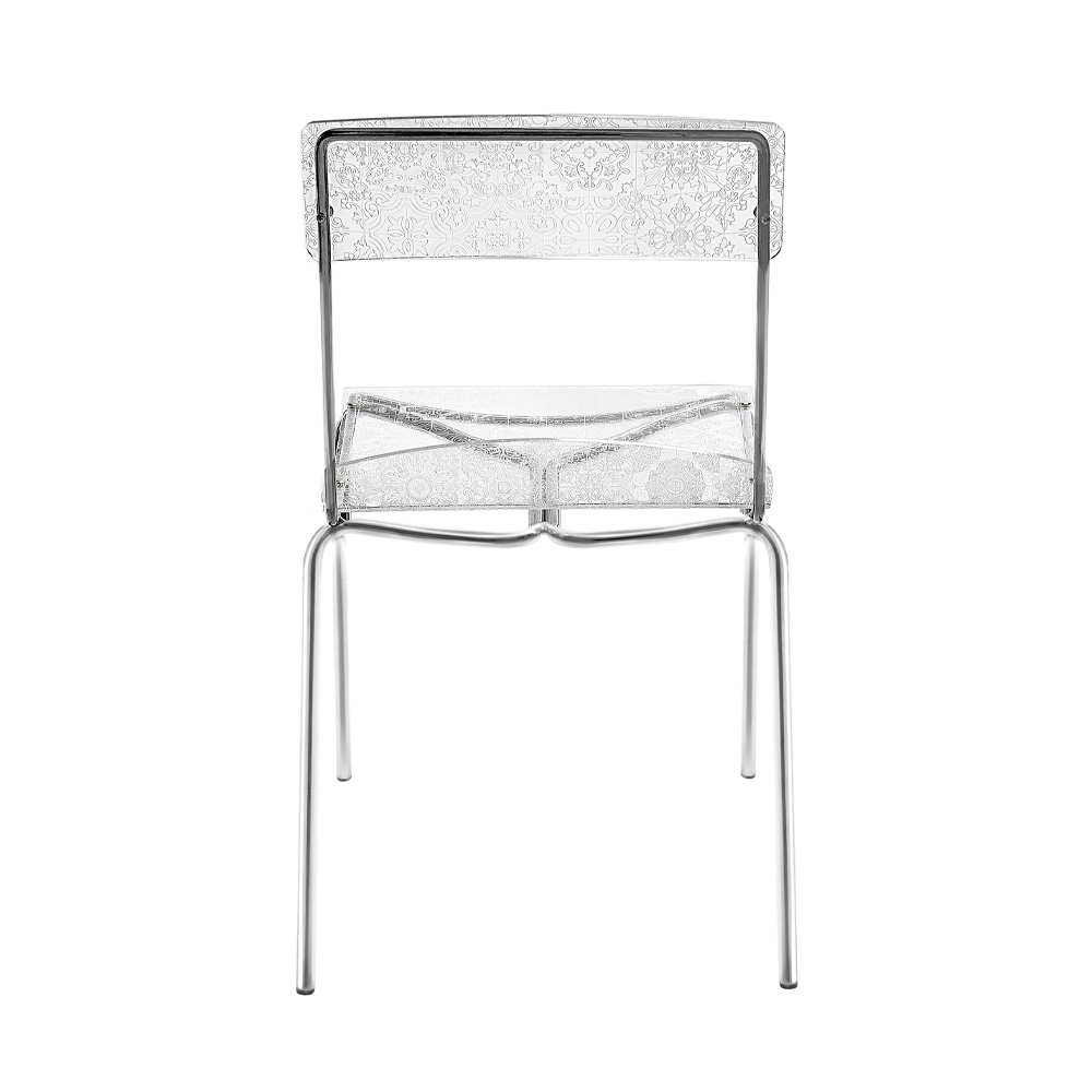 Der fachmännisch aus 100 % reinem Polymerplexiglas gefertigte Stuhl verfügt über eine transparente Schale, die seine einzigartige Geometrie zelebriert. Jede Ecke, jede Linie, jede Kurve ist so gestaltet, dass sie das Licht einfängt und reflektiert und so Jahr für Jahr seinen makellosen Glanz behält.
