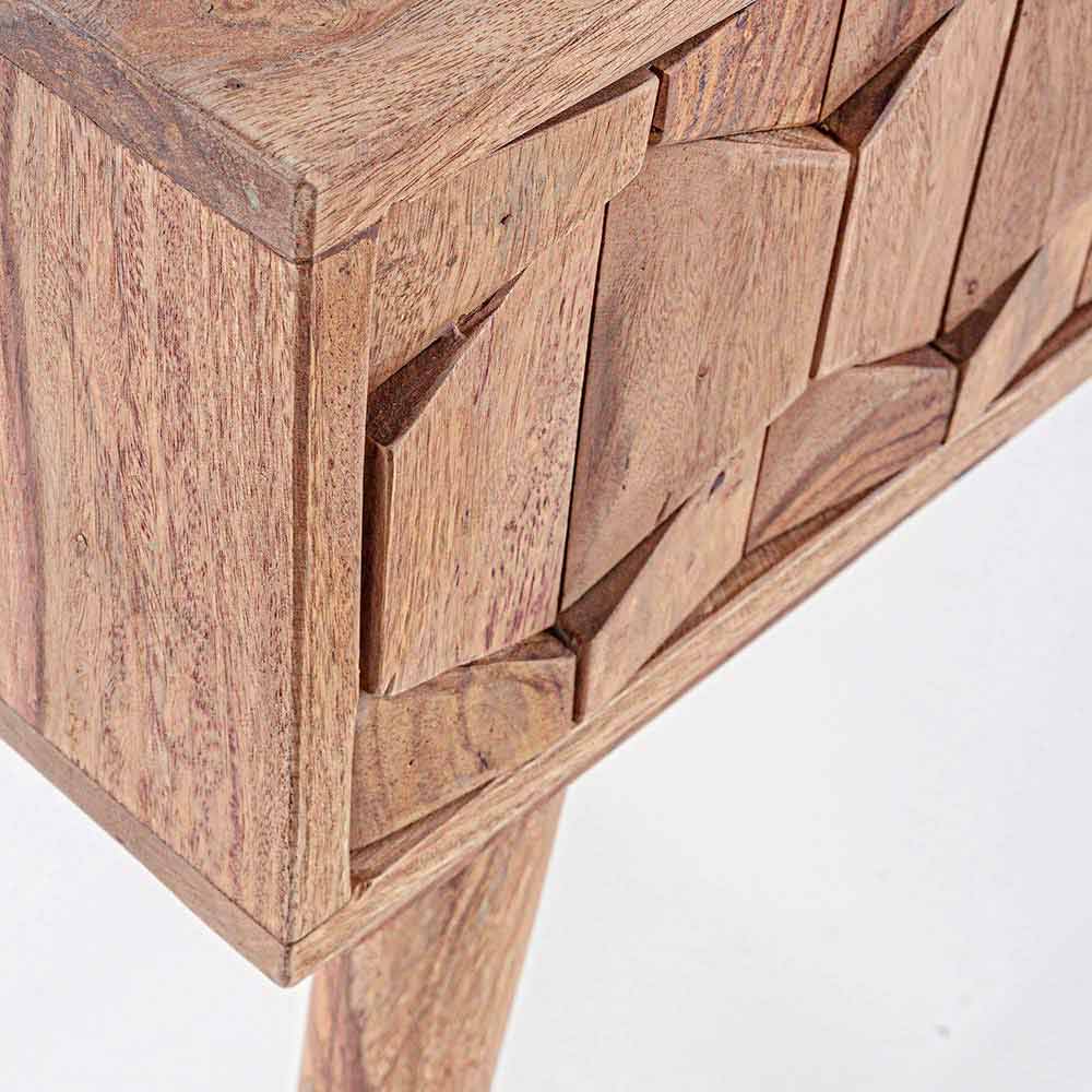 Diese Designkonsole besteht aus feinem Sheesham-Holz mit einem natürlichen Finish. Es ist ein mitteldickes Holz, das für seinen natürlichen Glanz bekannt ist . dafür und für seine Haltbarkeit im Laufe der Zeit ist es ideal bei der Herstellung von Möbeln. Entworfen mit zwei Schubladen von hinten und unten aus Sperrholz mit einem natürlichen Finish, während die Vorderseite dekoriert ist. Die eleganten Stahlknöpfe runden die Szene ab.