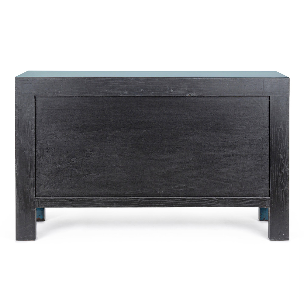 Dieses Design-Sideboard für das Wohnzimmer verfügt über eine blaue Ulme-Holzstruktur mit Sperrholzrückseite und Innenverkleidungen mit einer glänzenden und patinierten Wasserbasis.
