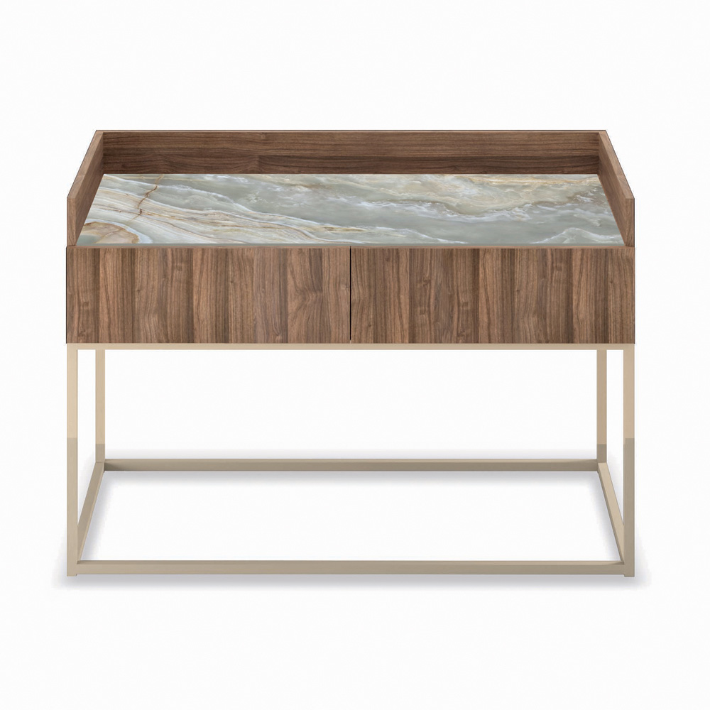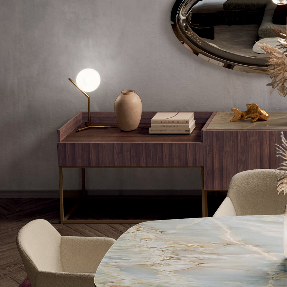 Wohnzimmer-Sideboard , komplett aus 18 mm starker Tannenholzplatte gefertigt , innen und außen mit Canaletto-Nussbaum furniert und in der Ausführung Canaletto-Nussbaum lackiert. Verstärkte und bearbeitete Rückwand und Platte aus Keramik oder Holz . Türen mit Push&Pull-Öffnung . Der Sockel ist aus Stahl mit Champagner-Finish und verfügt über verstellbare Füße.