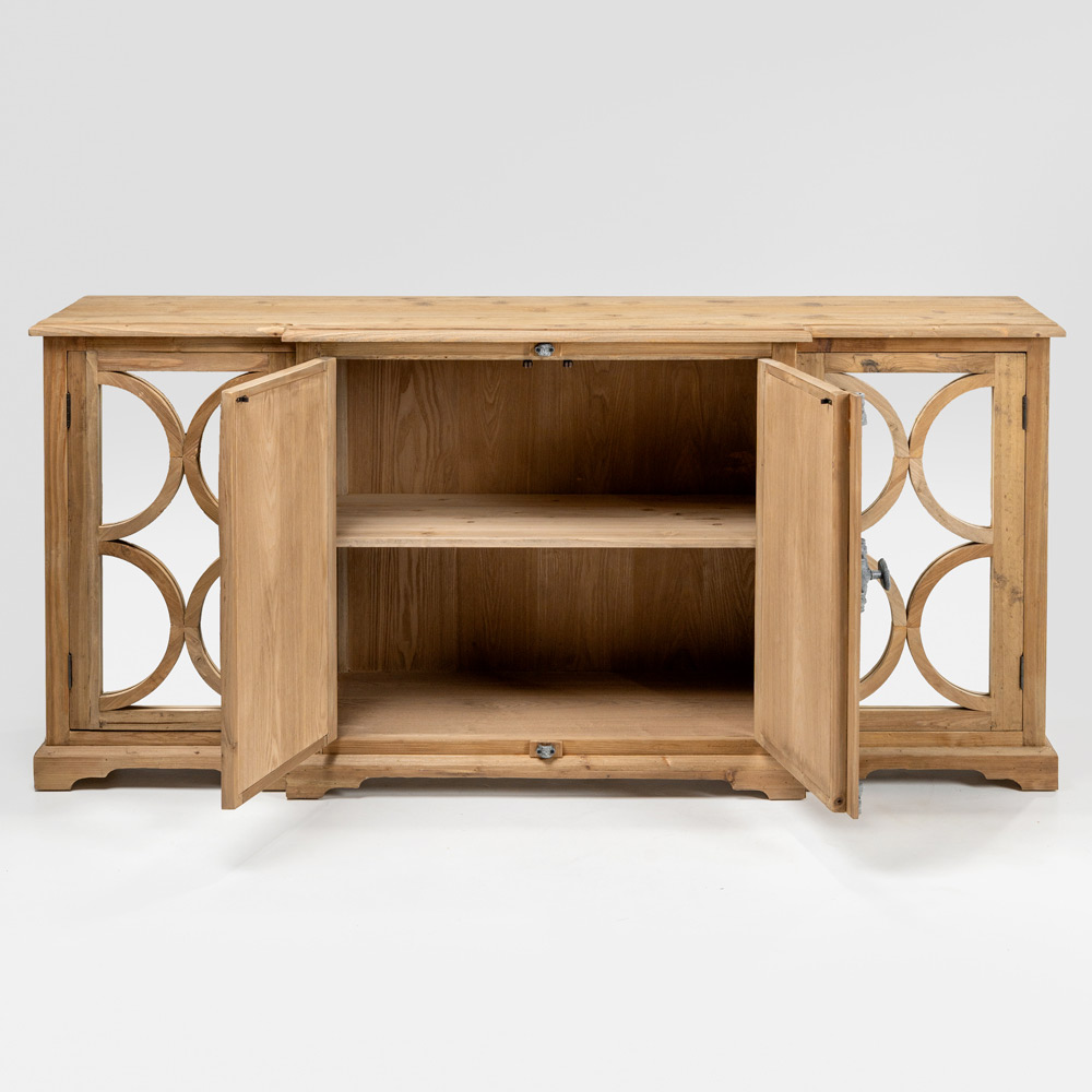 Dieses Sideboard aus gealterter, naturbelassener Kiefer ist ein beeindruckendes Möbelstück mit eleganten Spiegeltüren , die dem Raum Helligkeit und Tiefe verleihen. Die gealterte Oberfläche betont die Holzstruktur und hebt Maserung, Astlöcher und natürliche Unregelmäßigkeiten hervor.