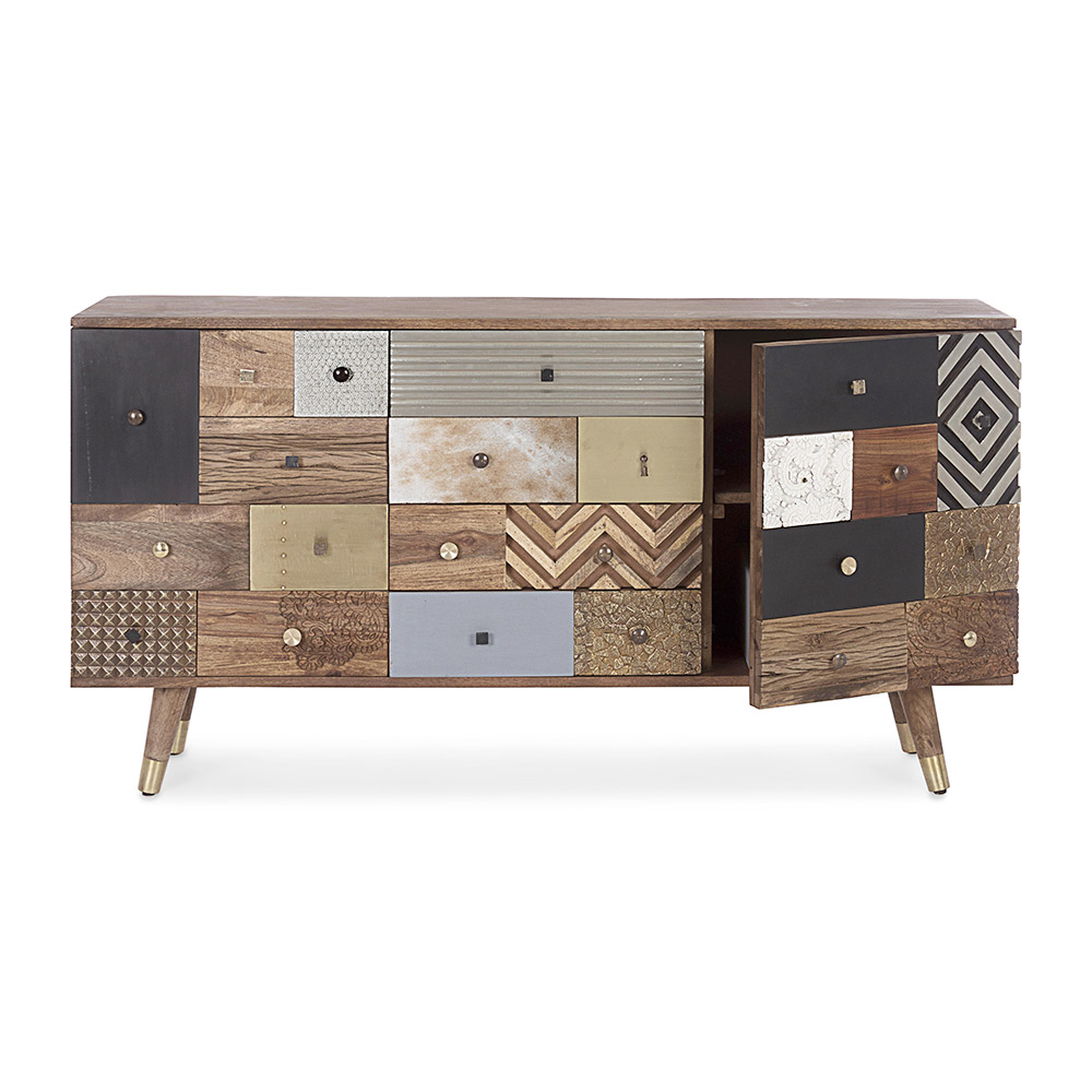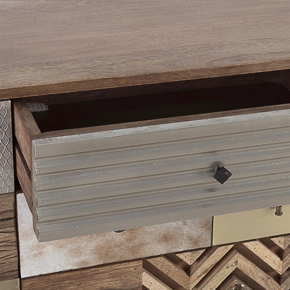 Die Front besteht aus 2 Türen und 4 Schubladen aus recyceltem Mango- und Akazienholz und Stahlgriffen.
