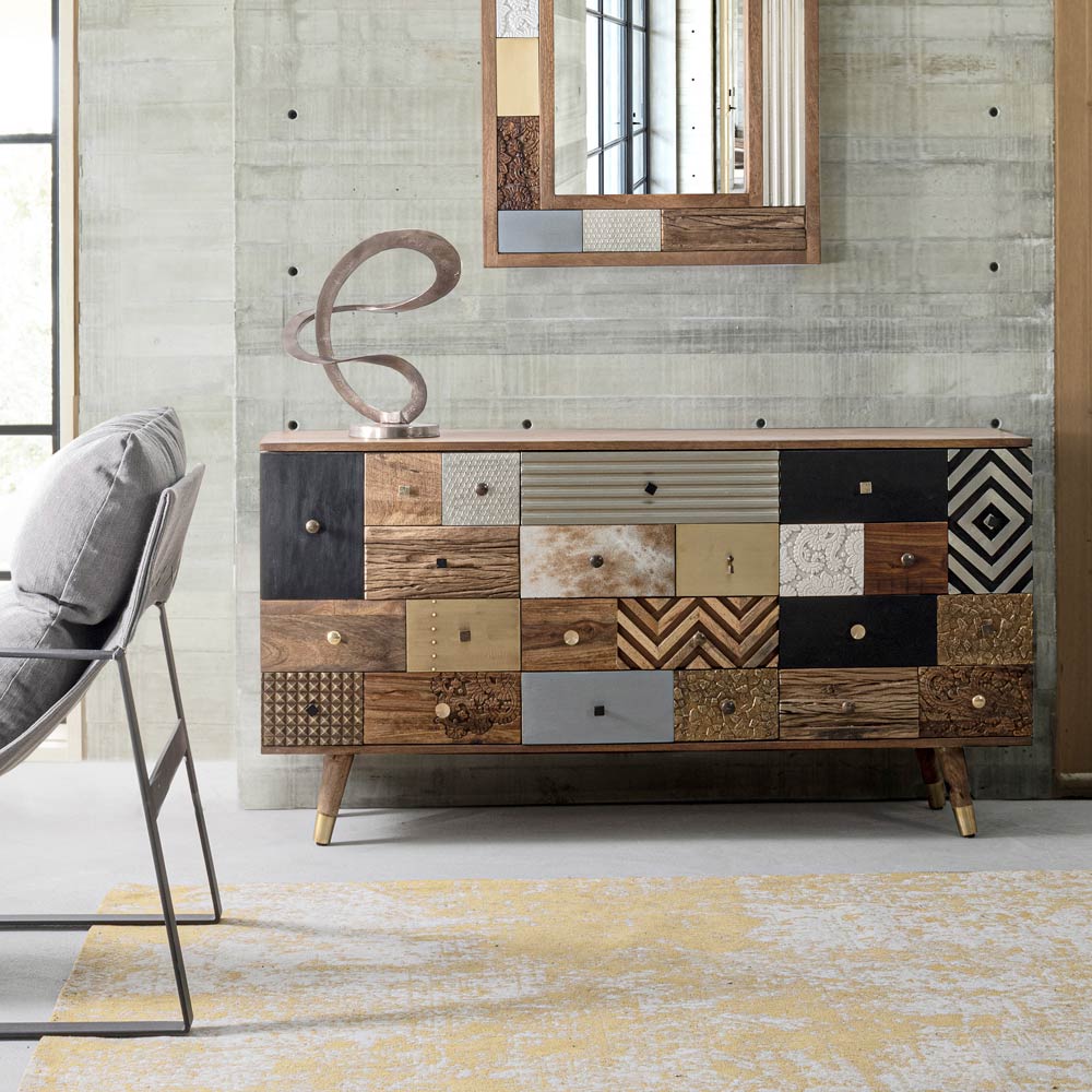 Sideboard aus Mangoholz mit 2 Türen und 4 Schubladen im Ethno-Stil.