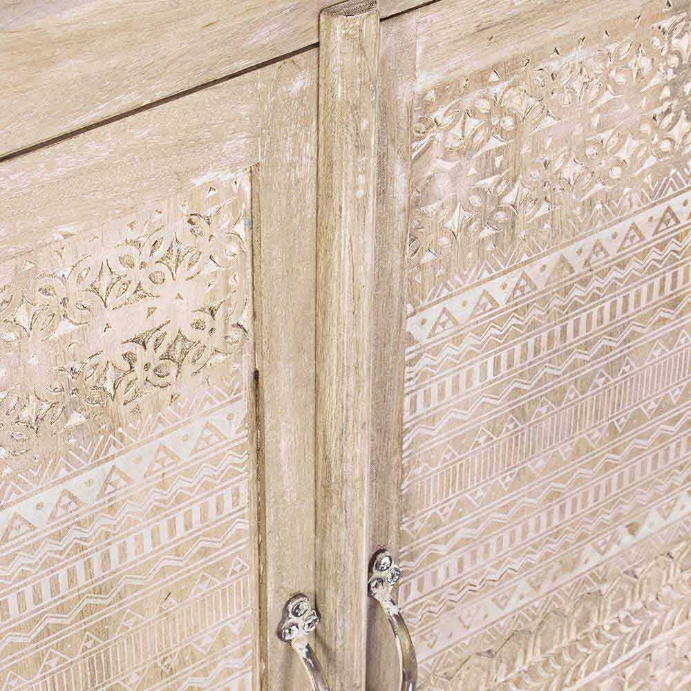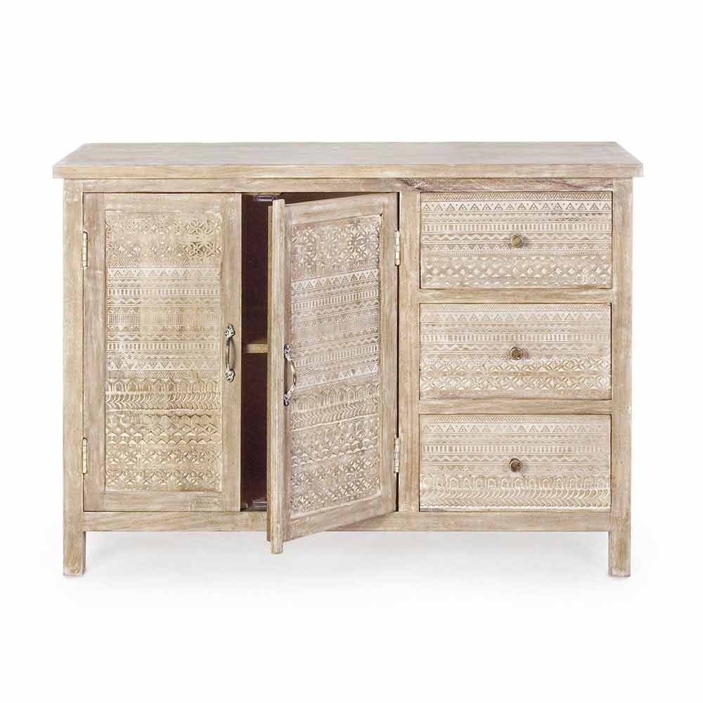 Struktur aus Mangoholz mit hand eingelegten Verzierungen, Rücken- und Bodenschubladen in mdf . Veredelung auf Nitrocellulosebasis. Türfach inklusive Regal. Messing Griffe und Knöpfe. . Größe: L 110 x P 40 x H 80 cm