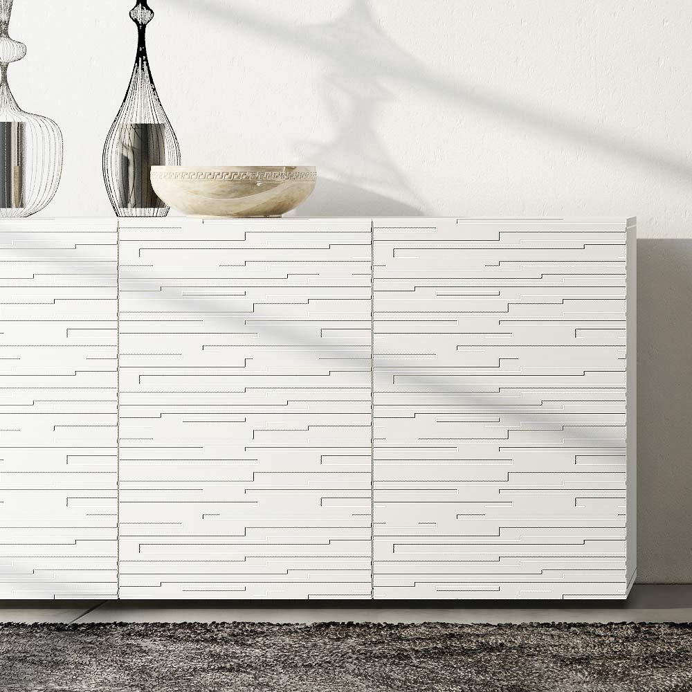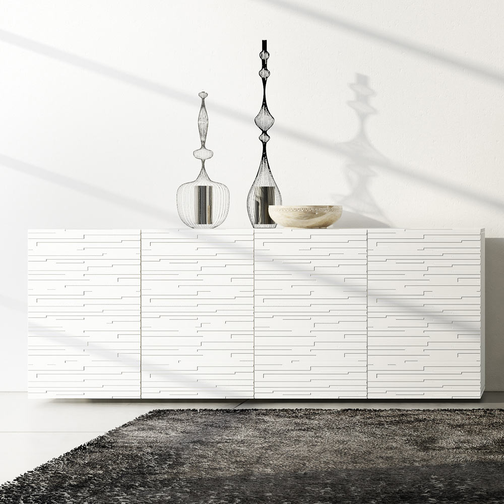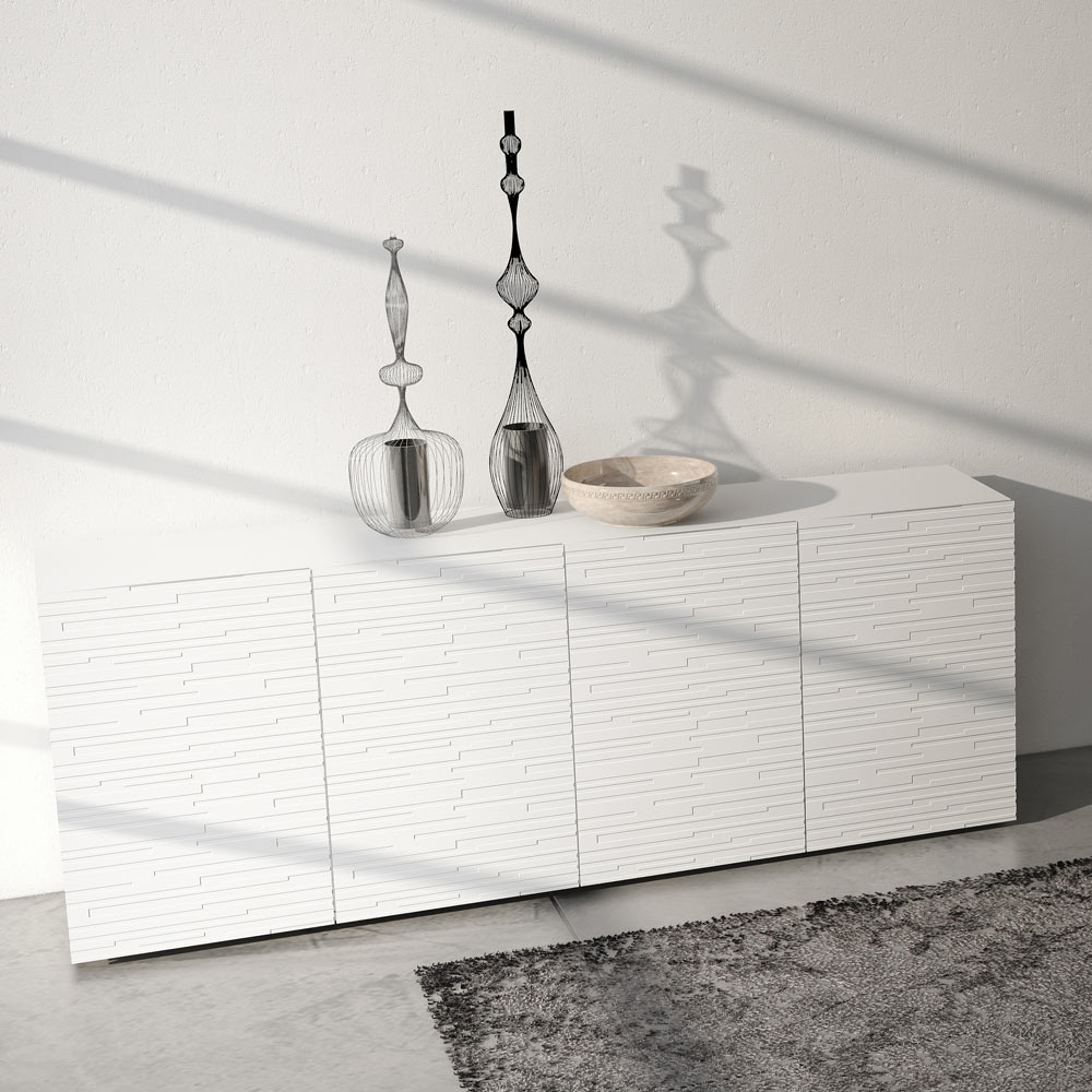 Wohnzimmer-Sideboard mit matt lackierterMDF- Struktur und mit Öffnungssystem mit 4 weiß matt lackierten Flügeltüren mit Basrelief-Dekoration. Dieses Produkt zeichnet sich durch Funktionalität und Design aus, dank seiner eleganten und raffinierten Oberflächen und der verschiedenen Materialien, die für seine Konstruktion verwendet werden, die eine hohe Qualität und Beständigkeit im Laufe der Zeit bieten und dem Produkt eine einzigartige und unvergessliche Note verleihen.