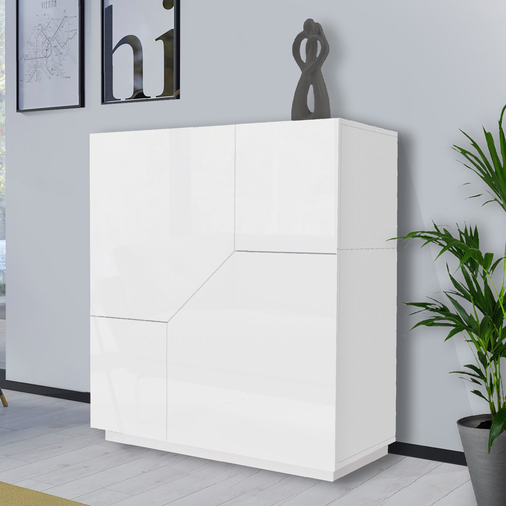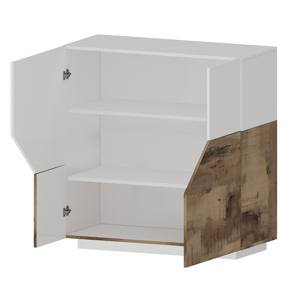 In Italien hergestelltes Wohnzimmer- oder Küchen- Sideboard aus Melaminholz mit einfachen, aber eleganten Tönen. Seine Struktur besteht aus 3 Aufbewahrungsfächern mit Scharnieröffnung, die einen hervorragenden Stauraum für Gegenstände bieten, und 2 Regalen, die das Produkt geräumig und funktional machen. Die Front in Weiß oder Holz, kombiniert mit den beiden Oberflächen, die die Ober- und Unterseite des Produkts abdecken, zieht die Aufmerksamkeit auf sich und schafft einen schicken und eleganten Effekt für ein einfaches und interessantes Farbspiel.