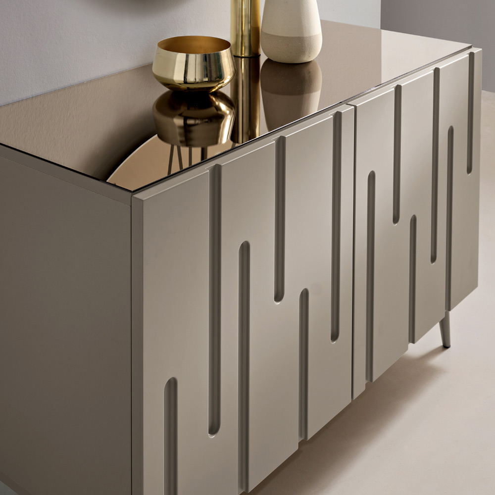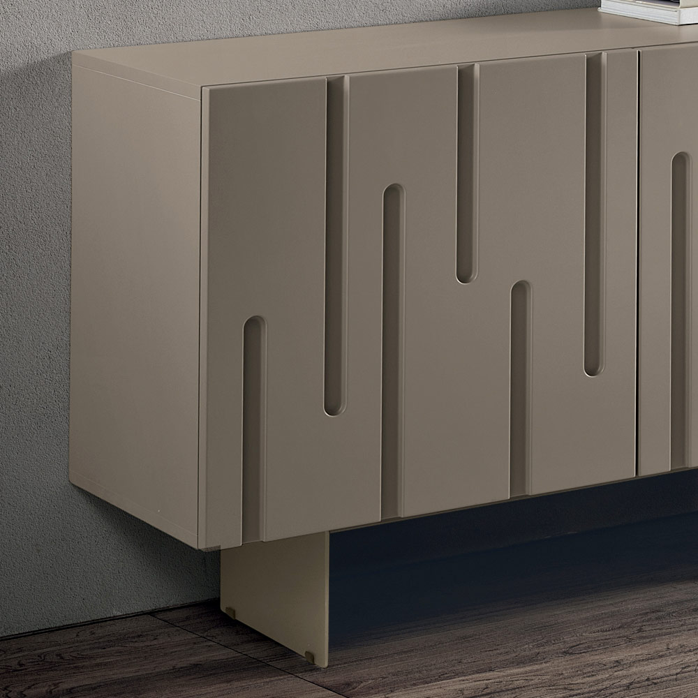 Die PVC-beschichteten MDF-Türen weisen unregelmäßige, vertikale Einschnitte auf, die an die natürliche Form von Stalaktiten und Stalagmiten erinnern und so einen raffinierten, strukturierten und dynamischen Effekt erzeugen. Dieses Zusammenspiel der Reliefs verleiht der Oberfläche Tiefe und Bewegung, verstärkt den Lichteinfall und macht das Sideboard zum Mittelpunkt des Raumes.