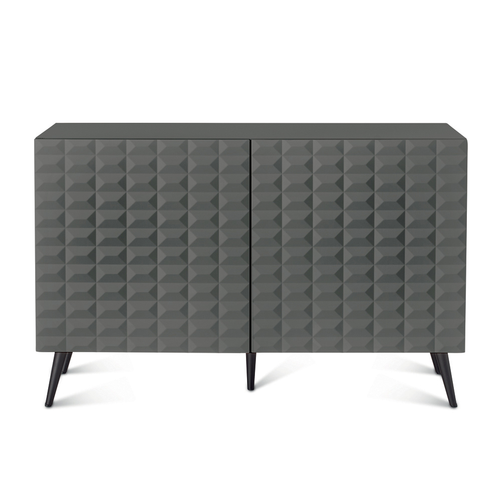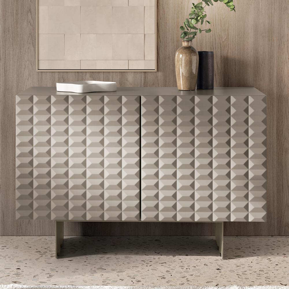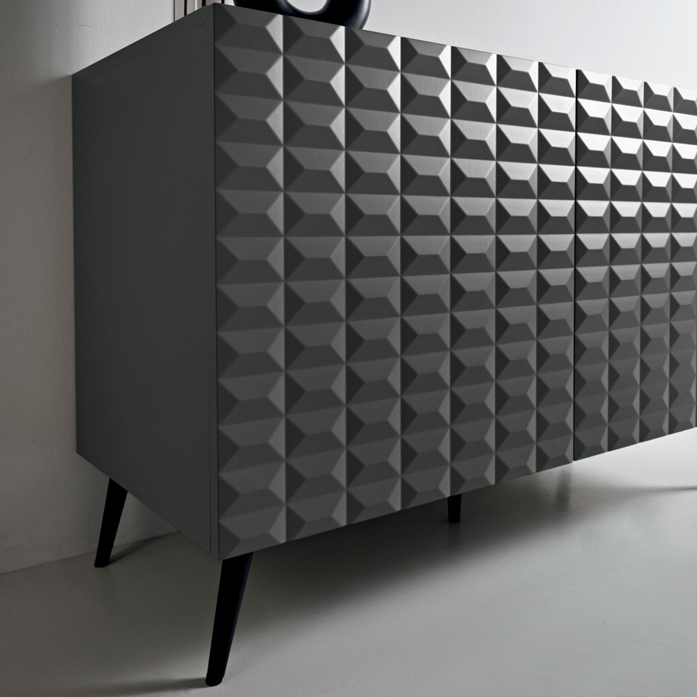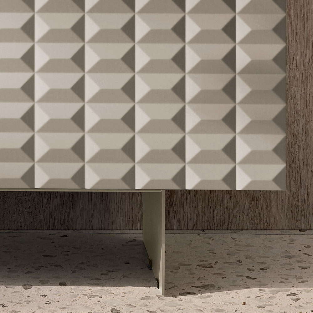 Die PVC-beschichteten MDF-Türen weisen eine dreidimensionale, geometrische Textur auf, die an die berühmten Rautenmuster erinnert und ein faszinierendes Licht- und Schattenspiel erzeugt. Dieses Detail verleiht dem Sideboard optische Tiefe und macht es zu einem echten Blickfang im Raum.